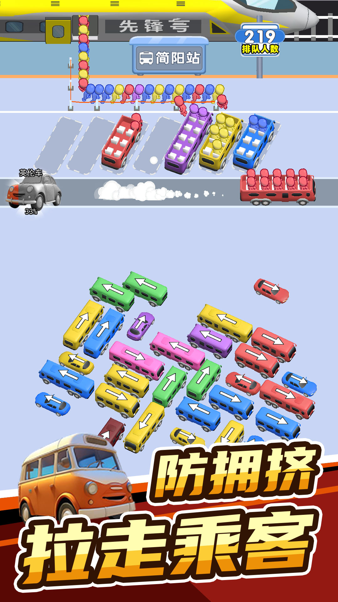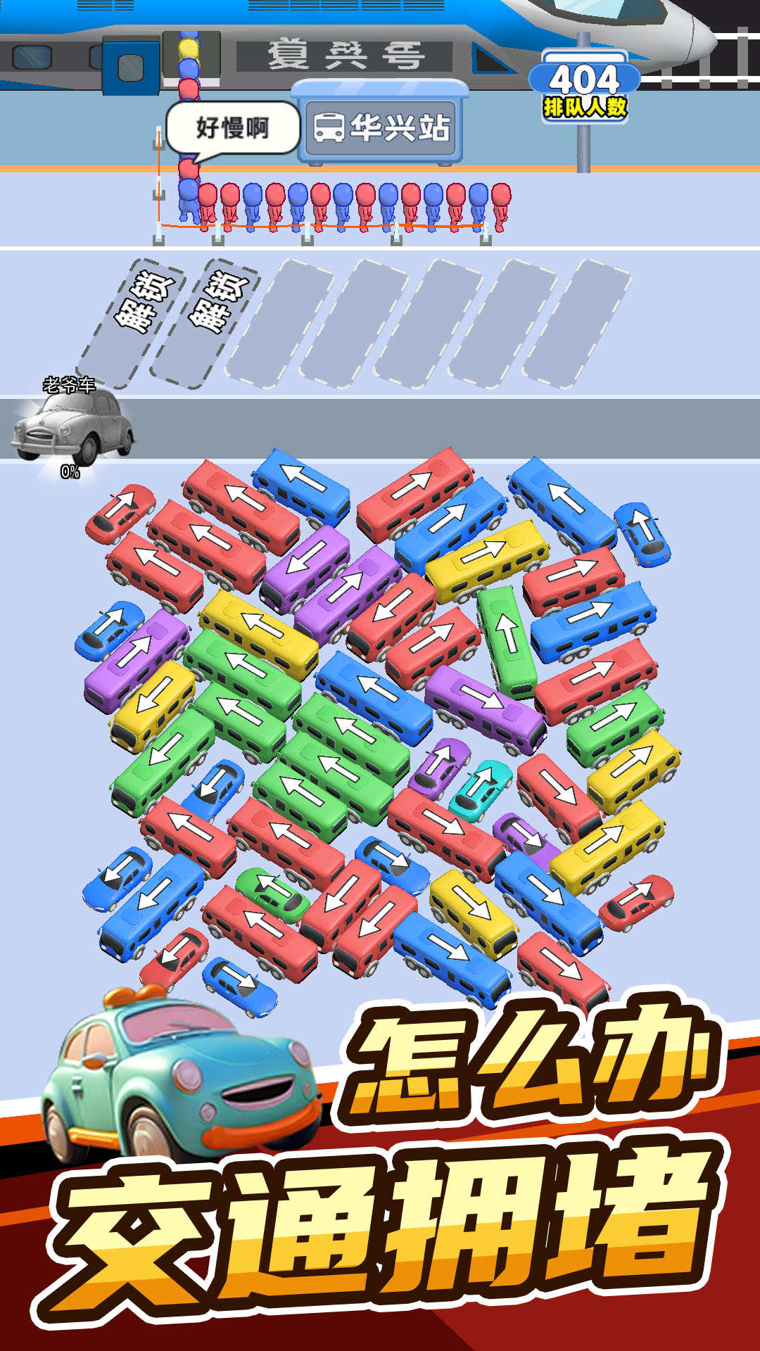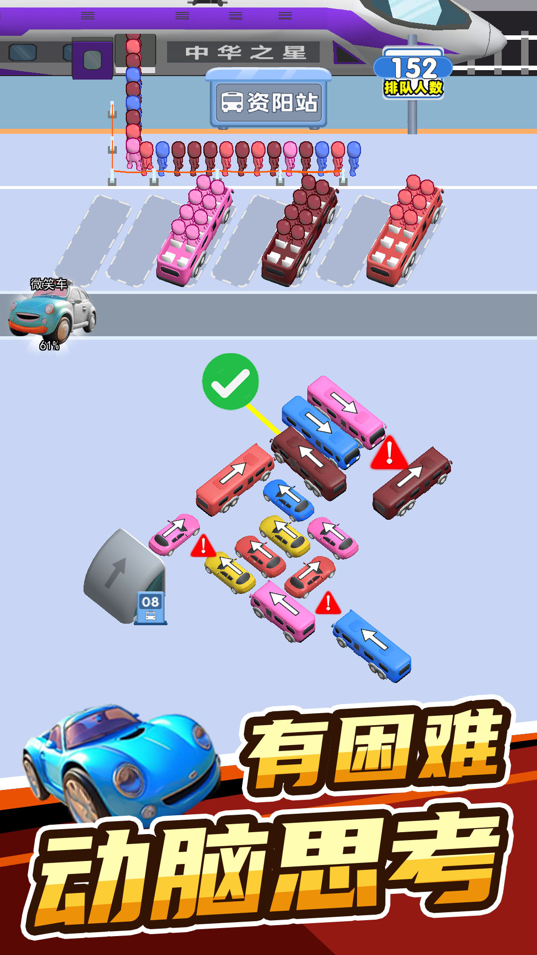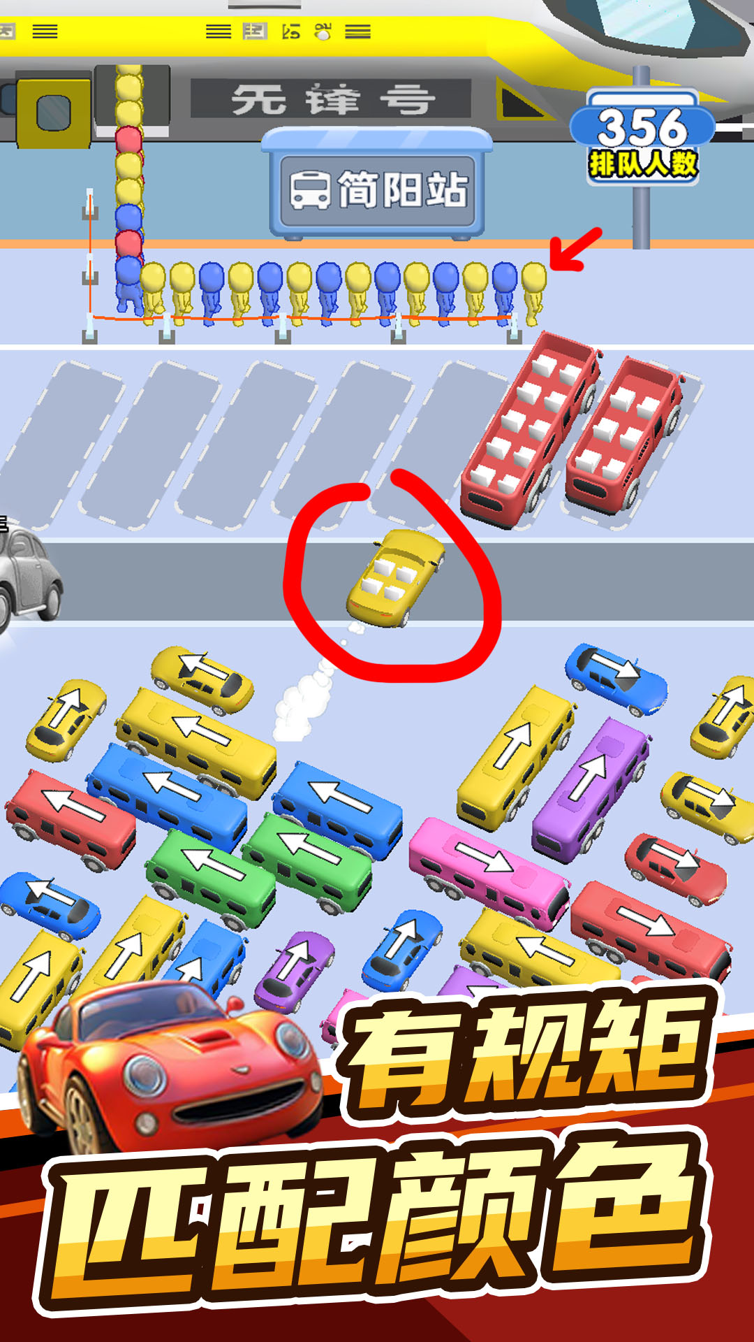 这一款清新卡通风格的思维游戏,玩家要控制各种颜色的车帮助小人顺利上车,每种车只能装载一定人数,需要合理控制。玩家需要利用思维按照顺序将停车场的车开出来并接上相应的乘客,注意被阻挡的车是开不出来的,所以要注意提前布局。