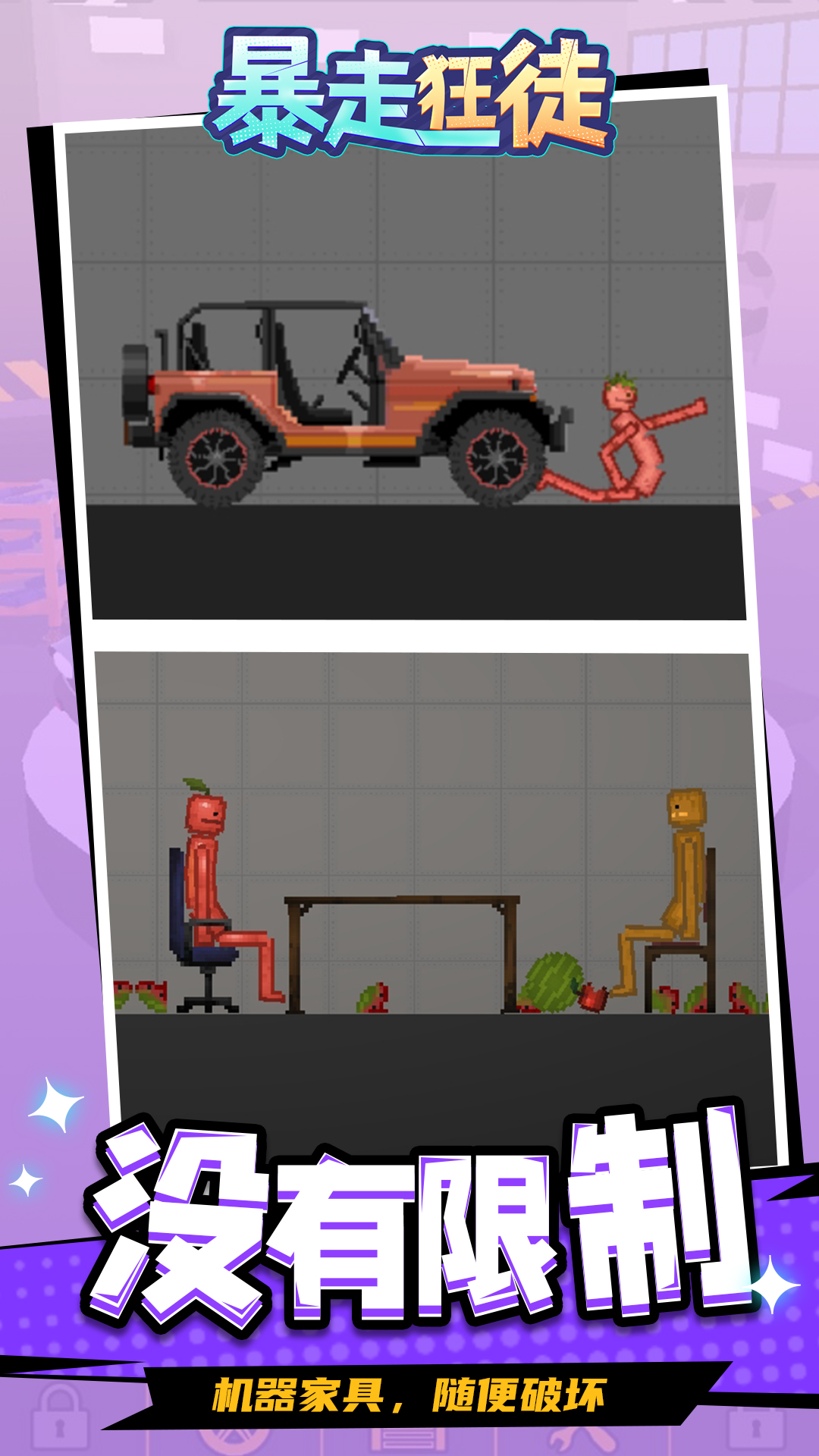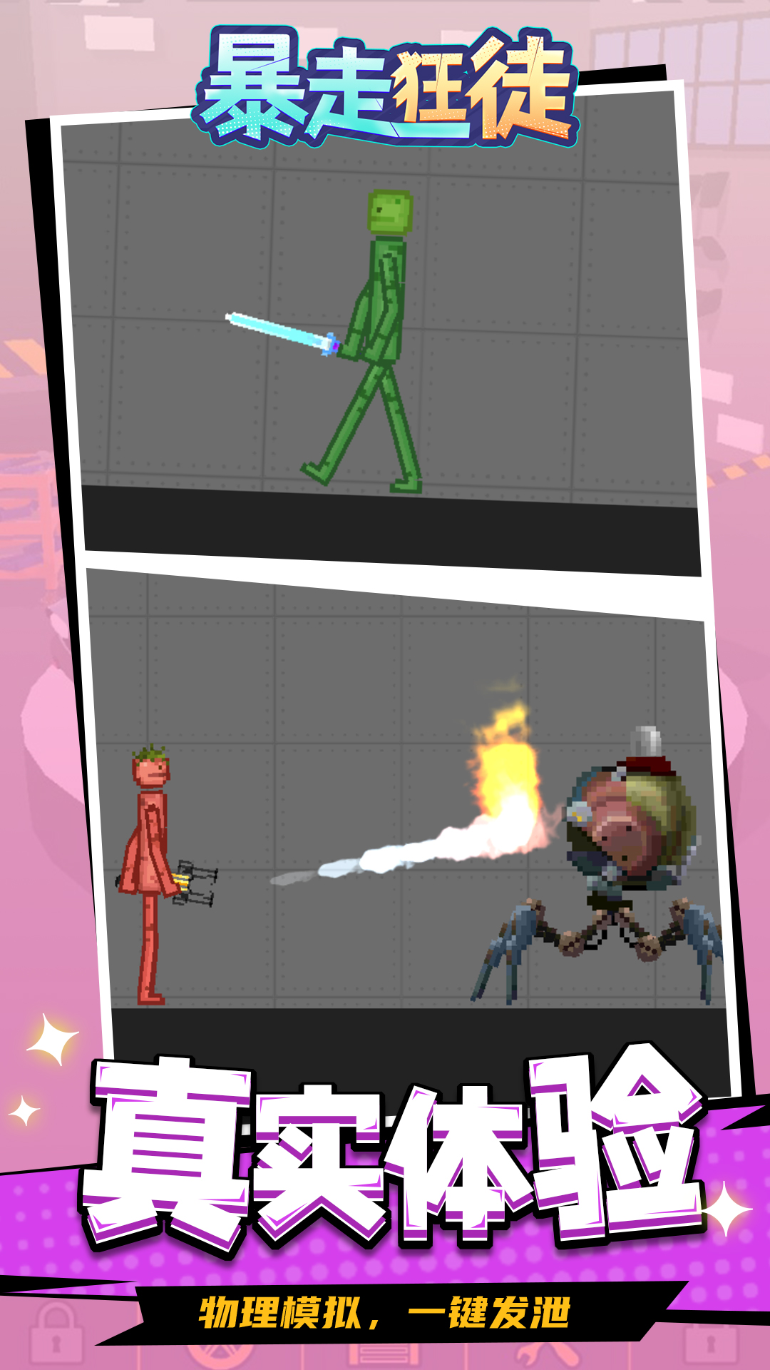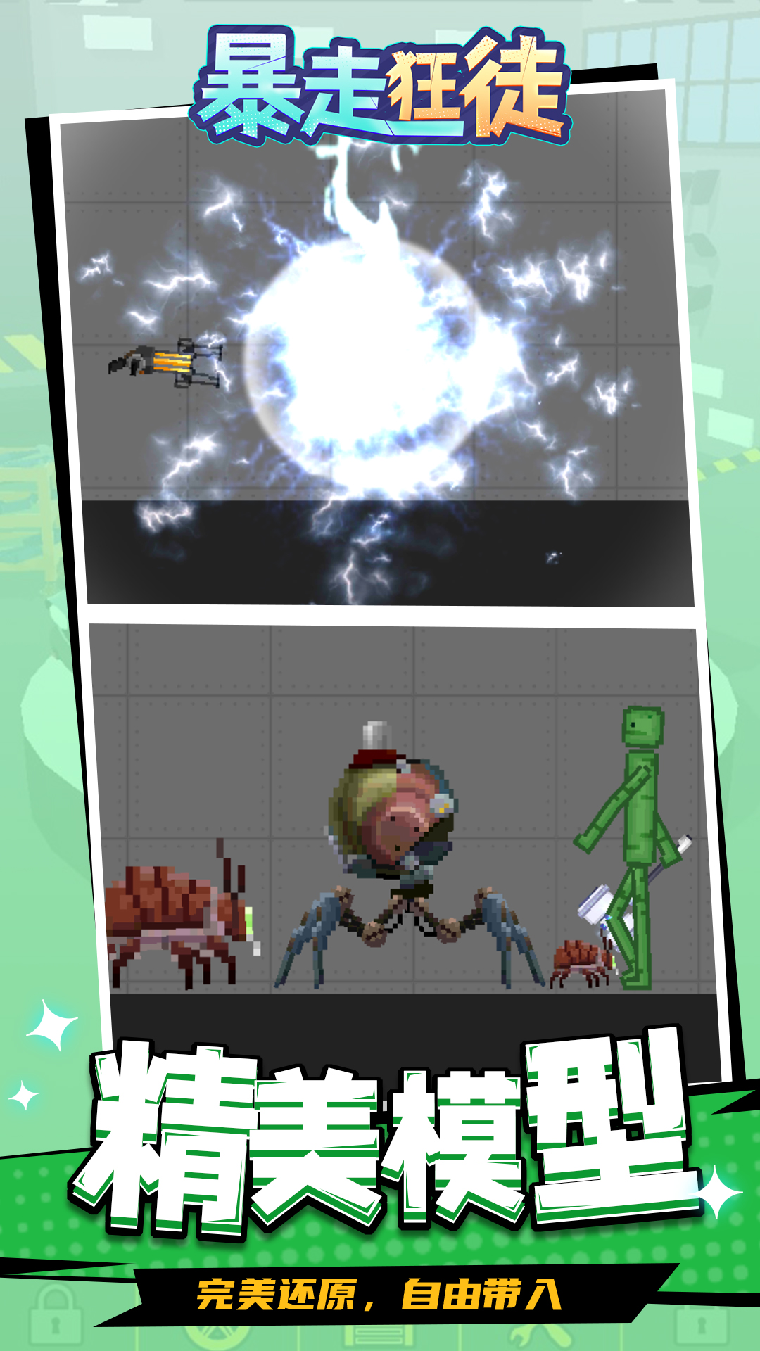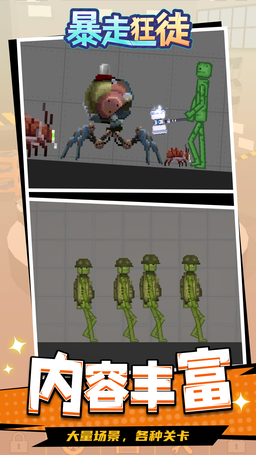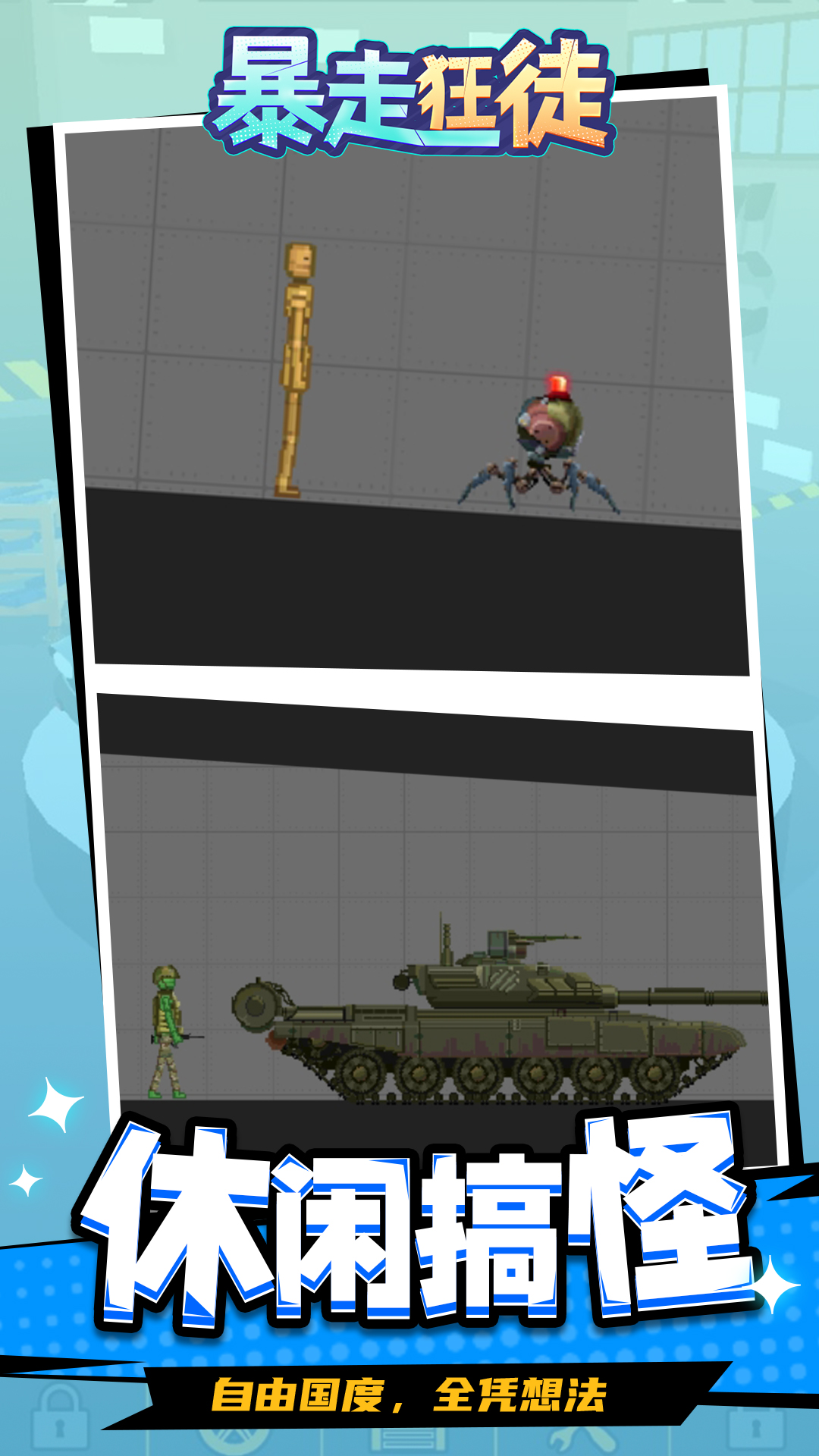《暴走狂徒》是一款沙盒模拟游戏,玩家可以根据自己的需求搭建各种场景,游戏中的所有角色和道具都可以自己安排,还可以为角色穿搭,将他们打扮成士兵、间谍、医生等自己喜欢的角色。利用有限的颜色和图形,组成了画面逼真的各式场景。快来体验一下吧!