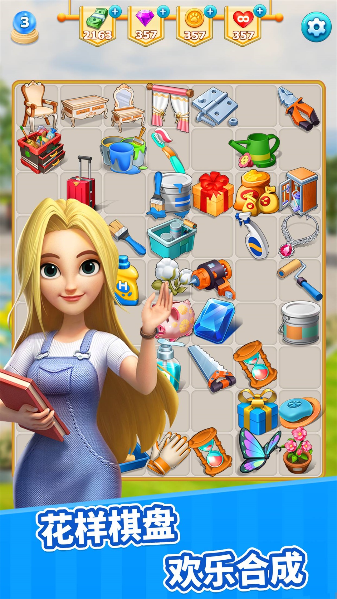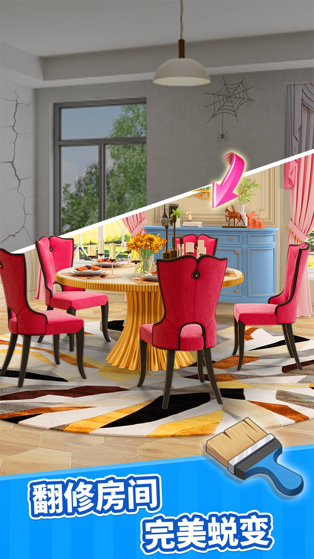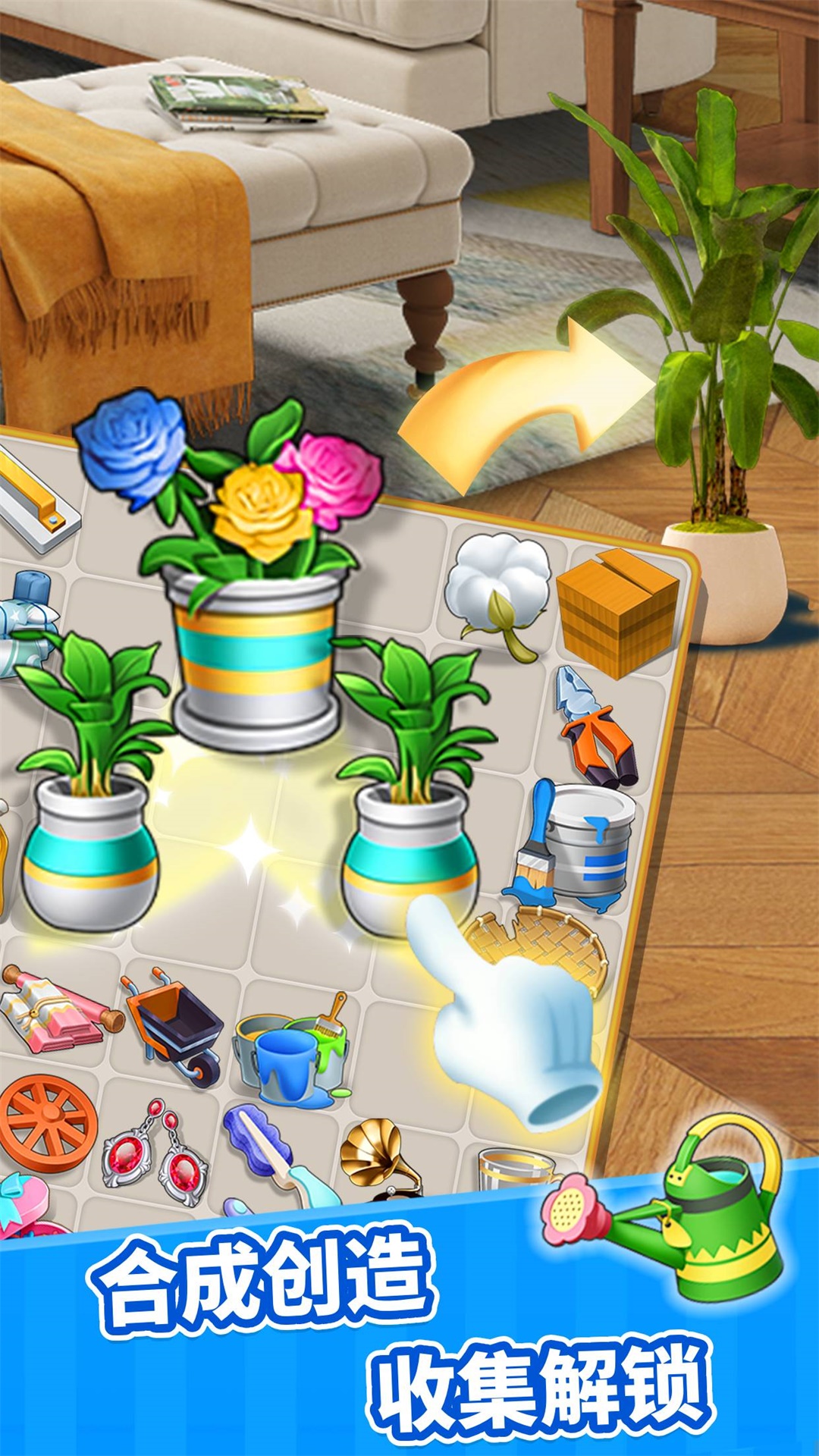 1. 轻松上手:游戏玩法简单明了,没有复杂的元素。您只要拖拽合并以收集物件,进行家居设计,这有助于您爱上家装。