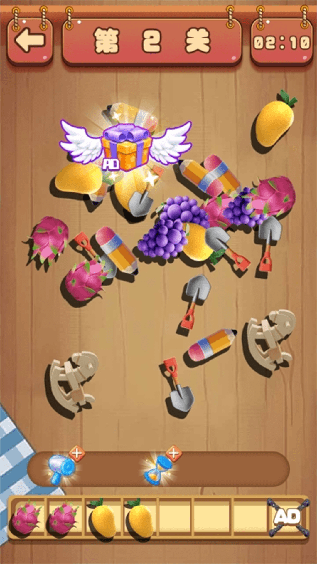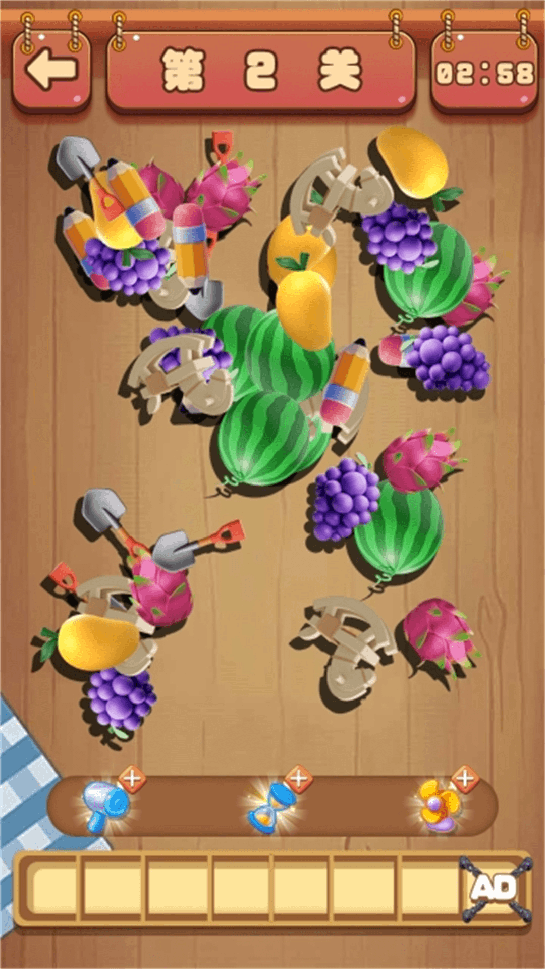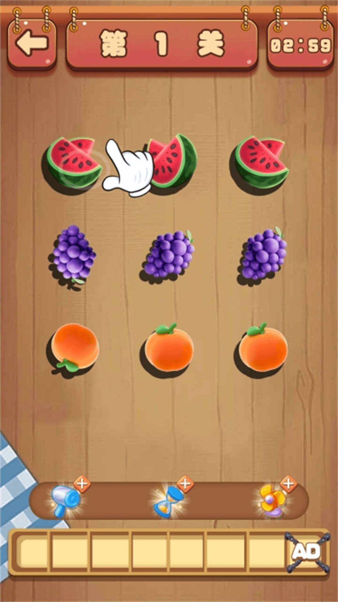 一款休闲类小游戏,游戏的核心玩法为三消,玩家需要选择三个相同的物品进行消除,下方的格子可以存放7个物品,当格子挤满后游戏失败。考验你的眼力,快速的找出相同的物品进行消除挑战吧,全部物品都消除后游戏胜利。还不来试试!