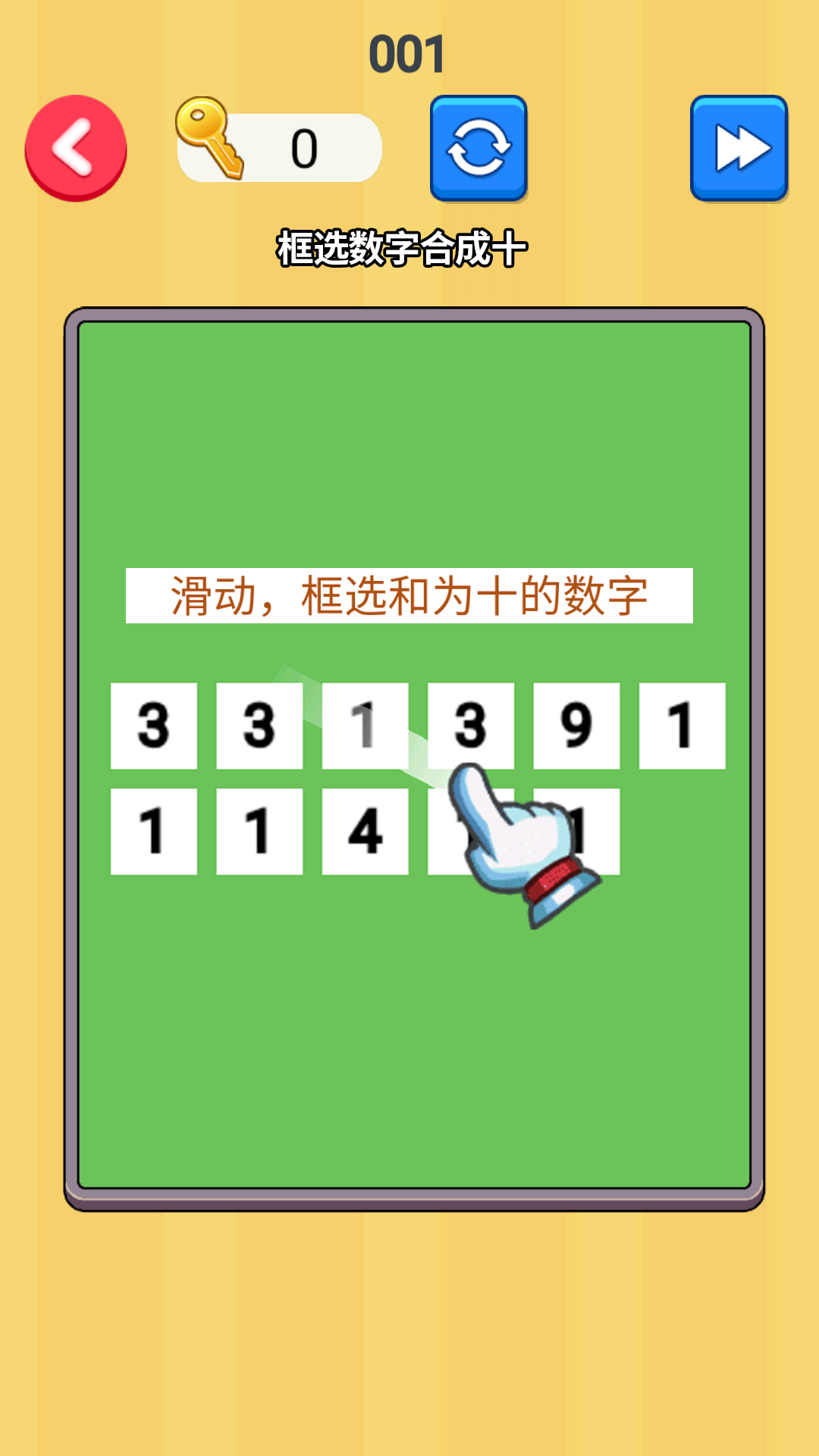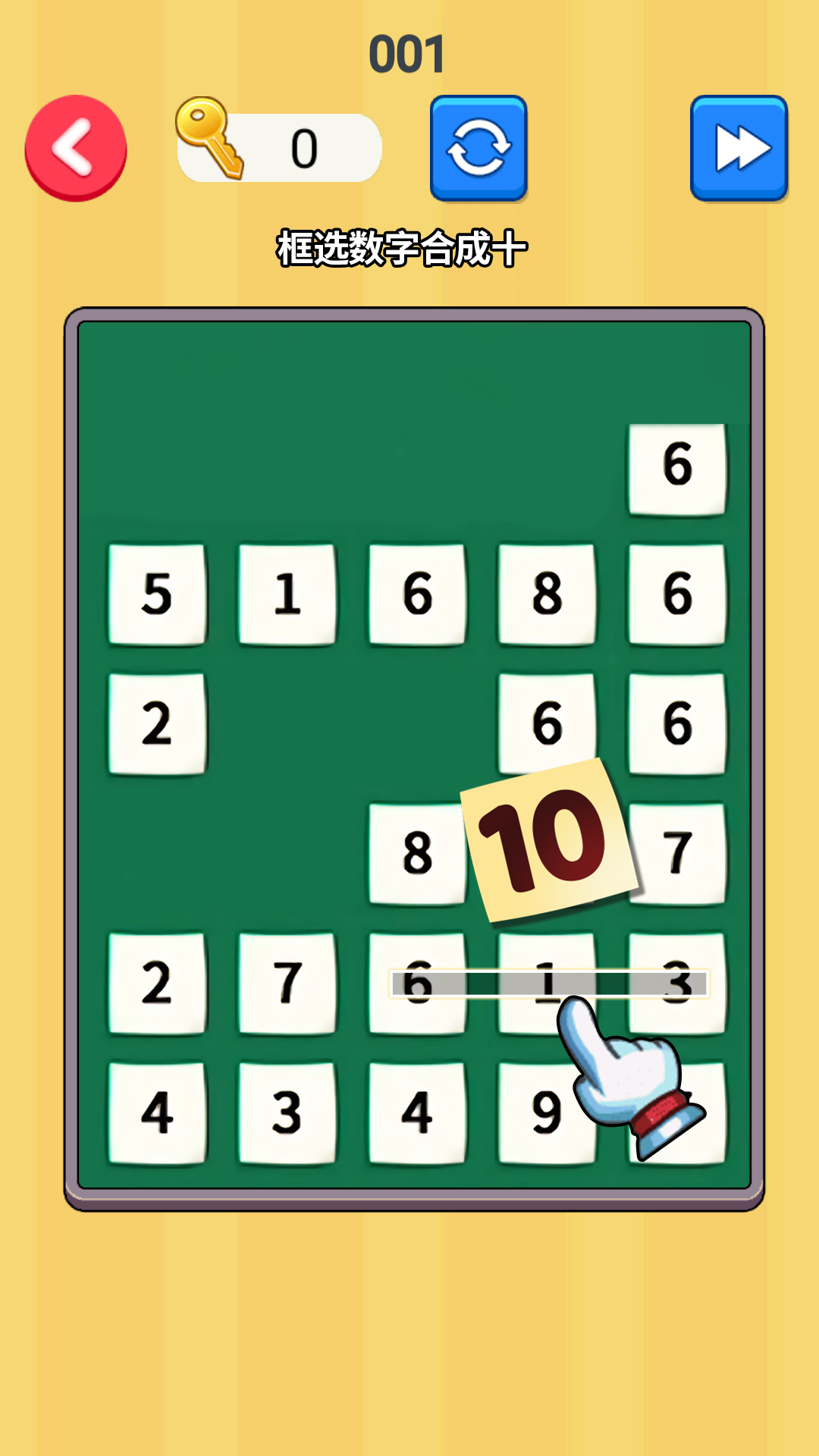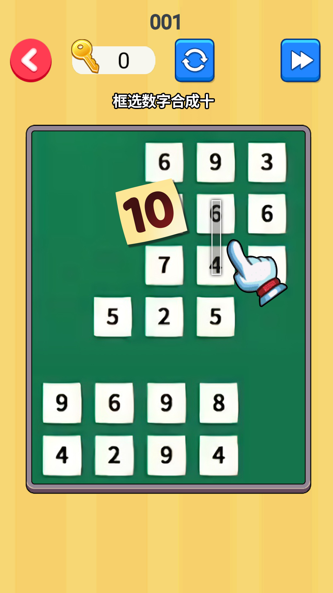 《数字消消乐》是一款休闲益智游戏,游戏中你需要将数字拖动框选在一起,好让他们组合加起来刚好等于10,这样才能正确的将它们消除掉。