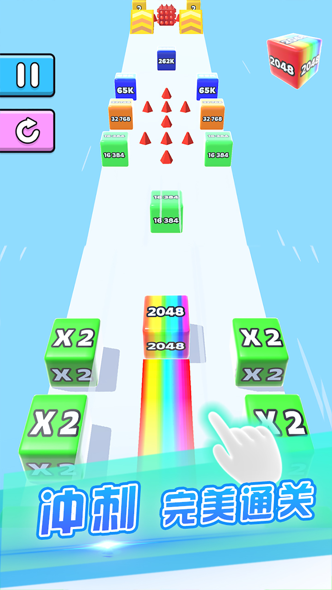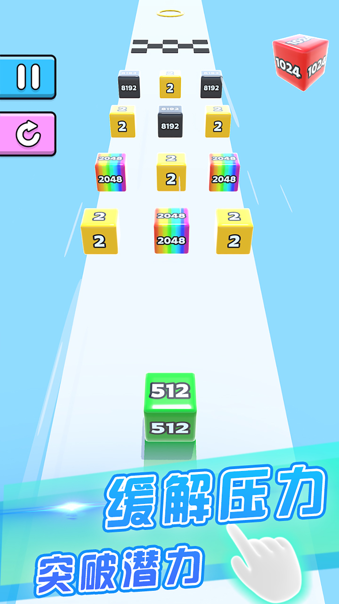 躲避不同的障碍物,按时分成两半,或将立方体合并为一个以达到 2048 或更多数字的终点,所有这些都采用玩家喜欢的拼图合并立方体游戏 2048 的风格,具有迷人的图形和有趣的动画!