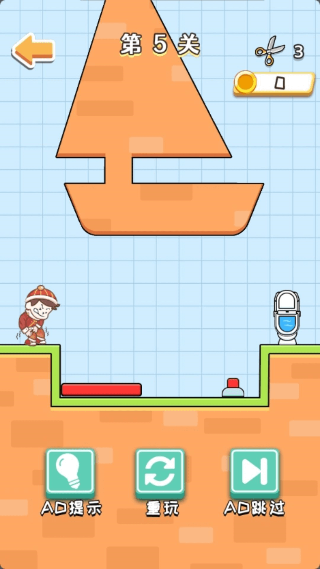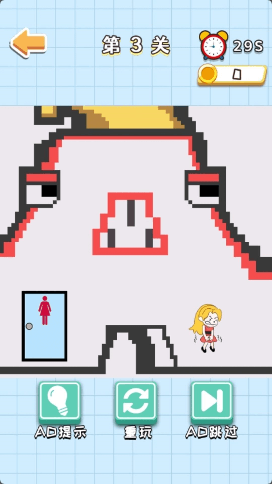 一款休闲类小游戏,游戏的核心玩法为帮助孩子安全的前往厕所,该版本无世界观背景设置。该游戏有着海量的关卡设计,每个关卡都有不同的困难阻拦孩子上厕所,玩家需要通过画线等操作帮助孩子规划上厕所的路线,成功的让孩子安全抵达厕所,快来一起闯关吧!