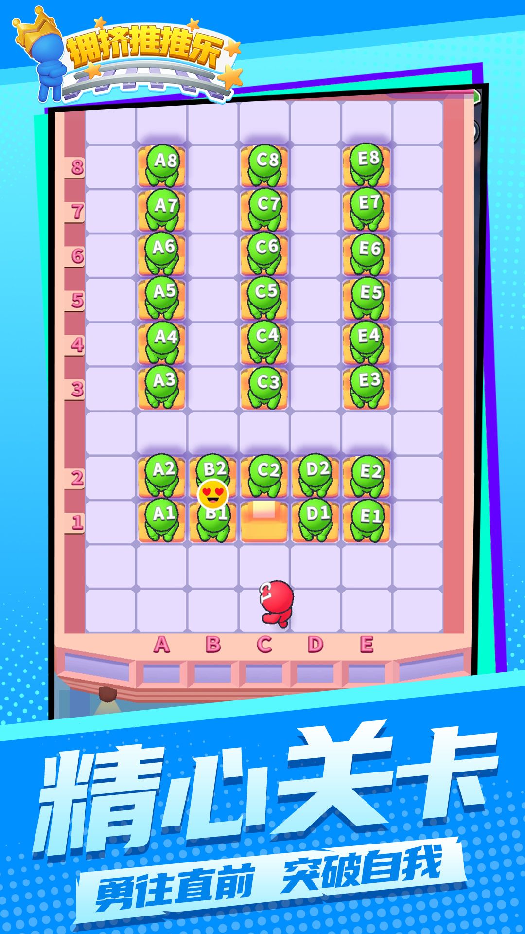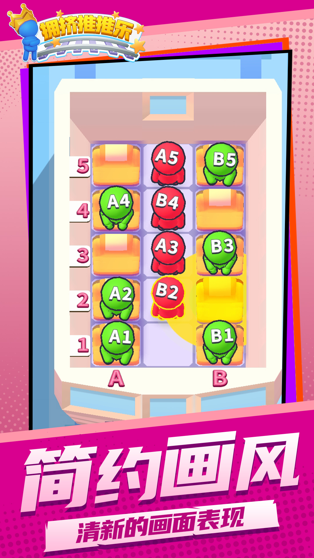 《拥挤推推乐》分类拼图玩法有趣且令人上瘾,你需要把所有愤怒成红色的乘客,顺利的带到正确的座位上,以此来缓解他们的不安。游戏中的乘客造型,独特且可爱,圆圆的脑袋,小巧的身体,在走动的过程中处处显露出迷人的动作。由浅入深的关卡设计,简单的玩法,易于上手的操作,令玩家更容易沉迷其中。