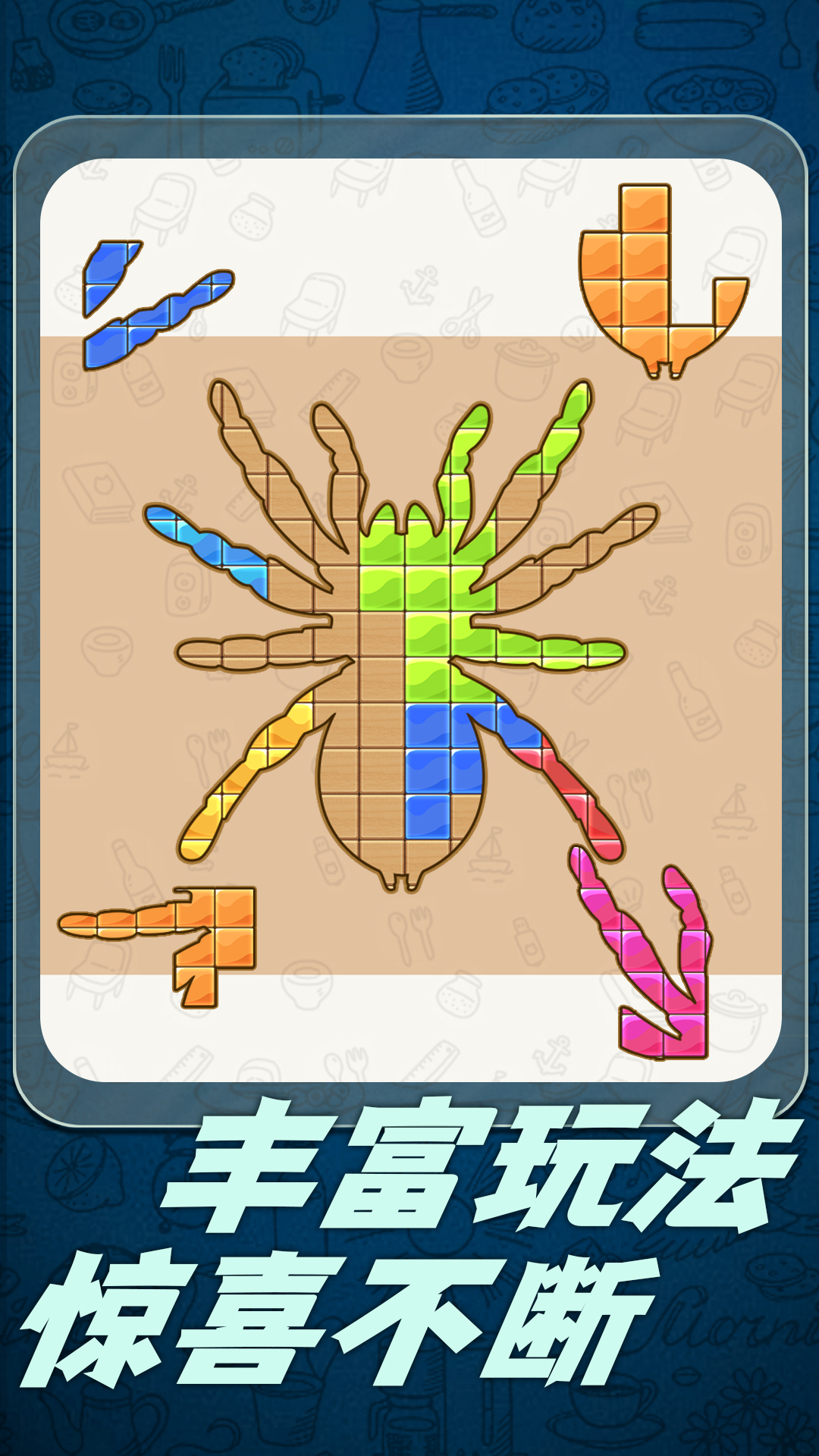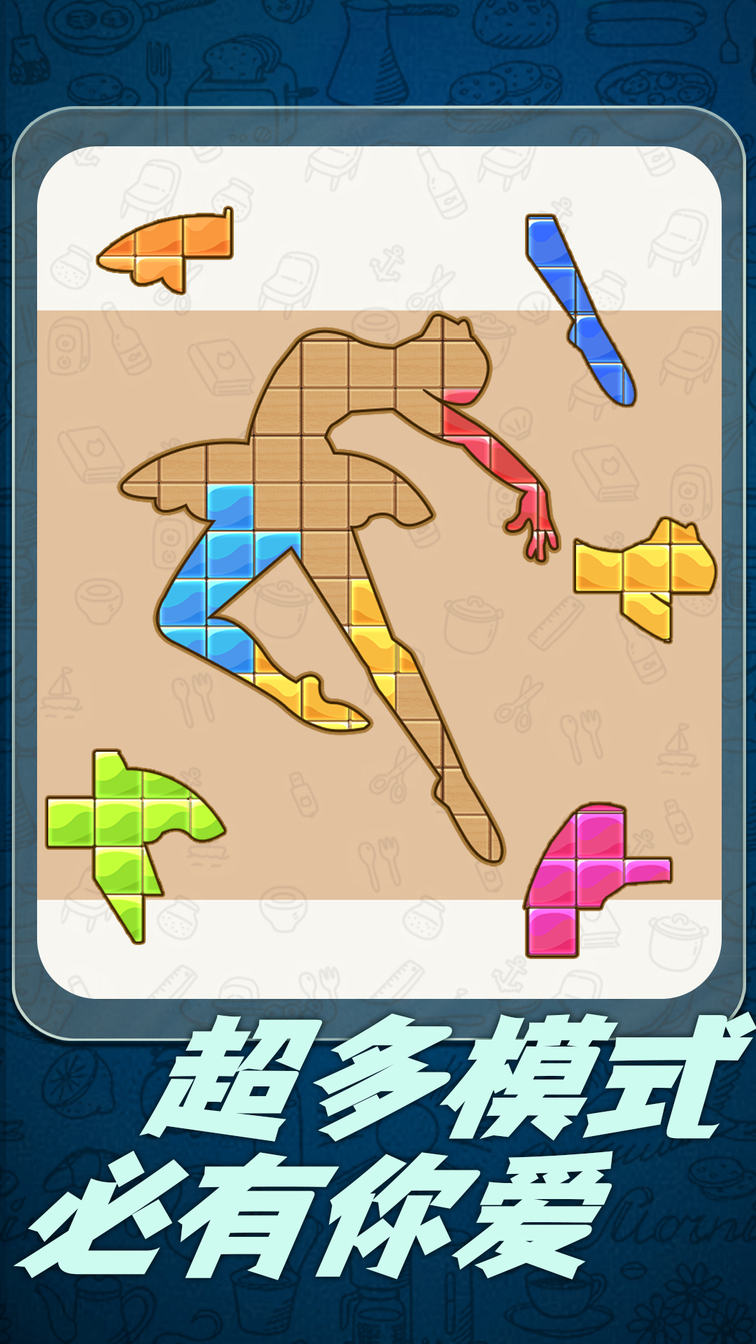 疯狂益智拼图是一款休闲益智游戏,在游戏中,游戏画风清新,优美。游戏内容欢乐,有趣。各种木板都有不同的颜色。快来试试吧