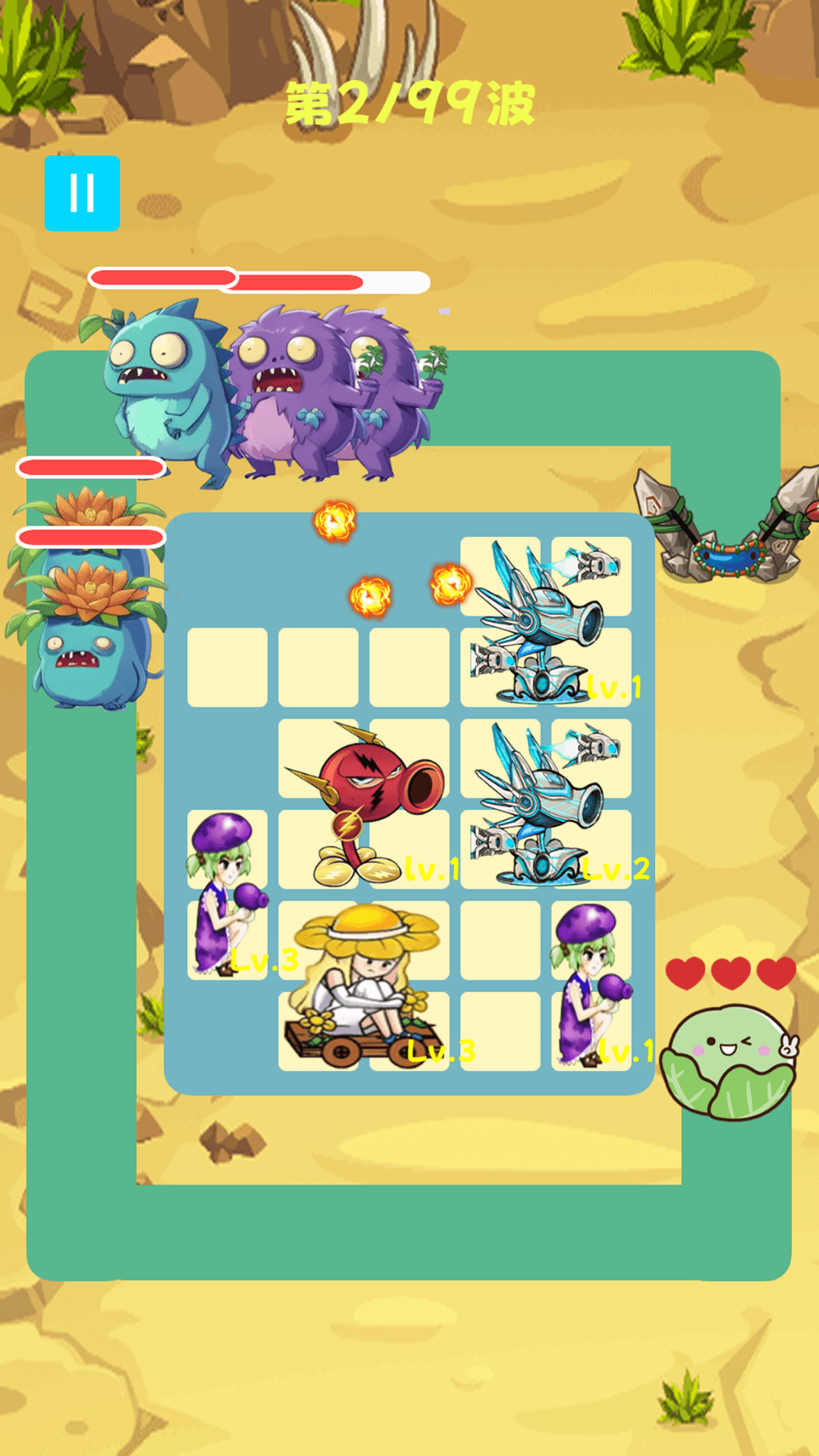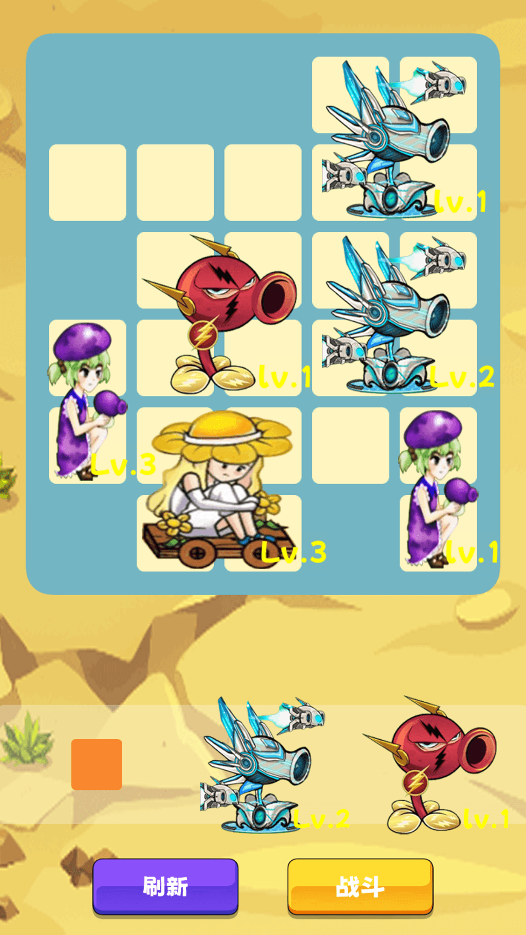 一款休闲塔防游戏,在战斗开始前,玩家需要尽可能将植物填满格子并升到高等级,开始战斗后,植物将自动开始攻击进攻的僵尸,看看你能在僵尸的攻势下生存多久。