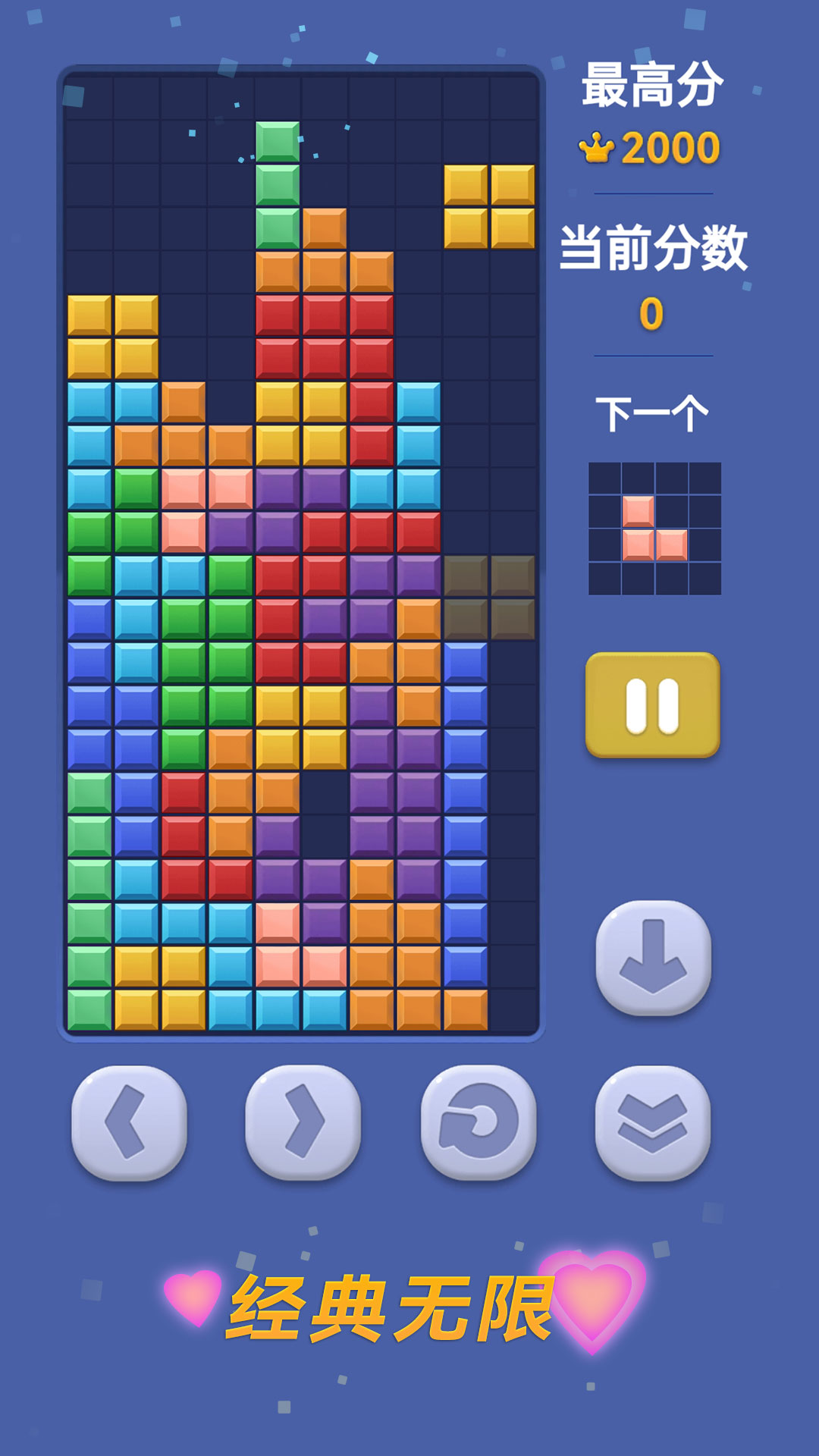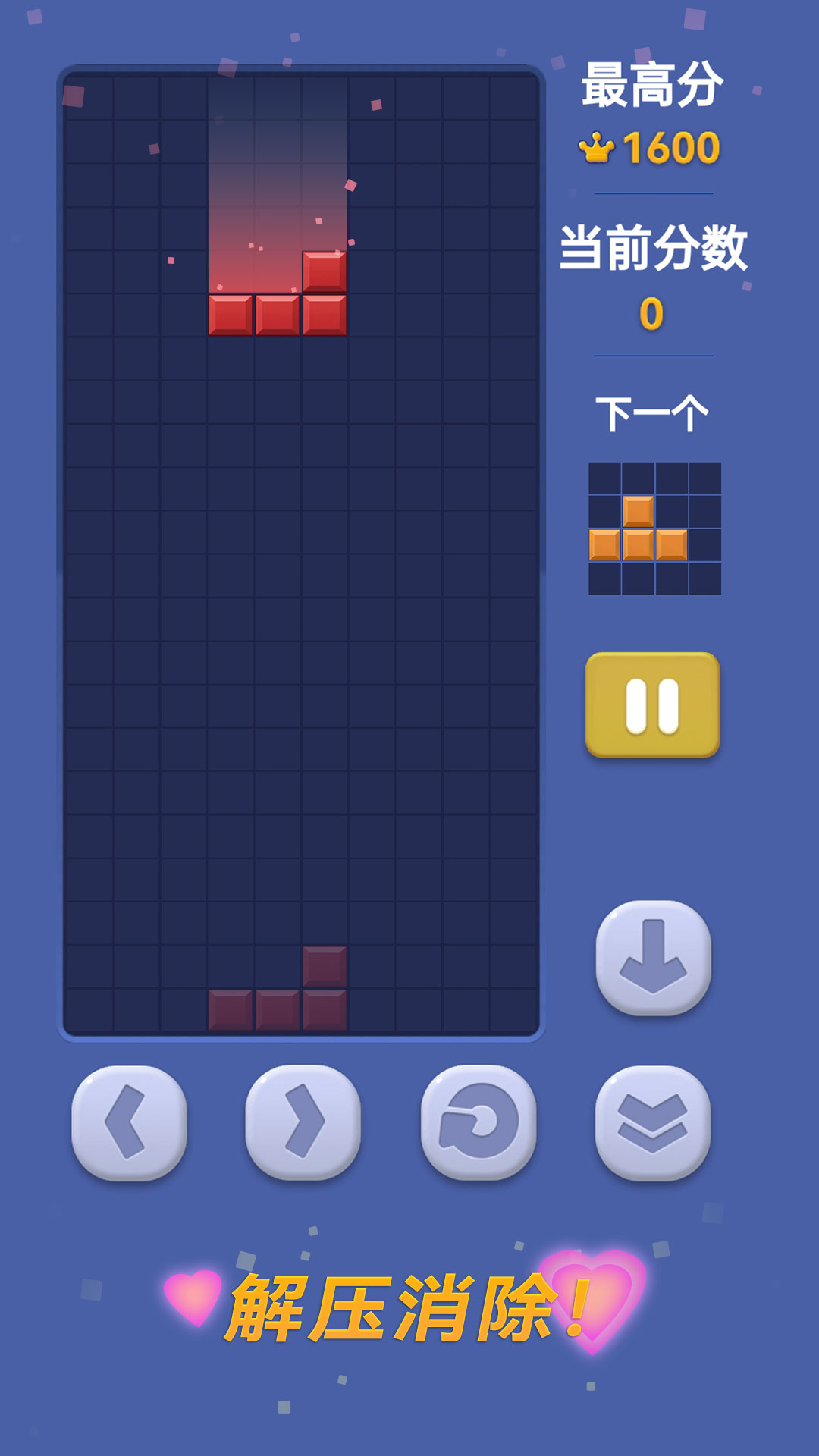 按钮操作或者滑动操作,将不同形状的方块叠满一行即可消除。 同时消除的行数越多,得分越高。