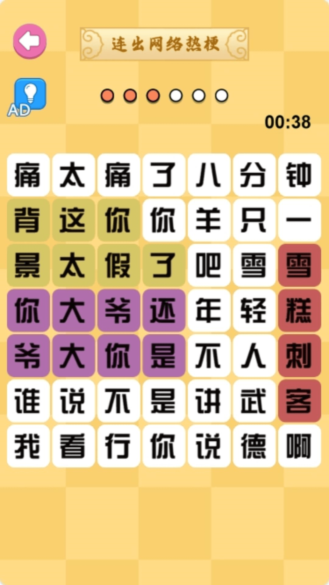 一款休闲类小游戏,游戏的核心玩法经典的文字小游戏,在新世纪,文字竞赛火爆全球,作为一个文字运动员,去参加文字游戏竞赛并获得胜利吧!通过观察关卡内的所有汉字,点击屏幕来找出所有的字能组成的热梗通过关卡,进入下一关。赶紧来挑战吧!