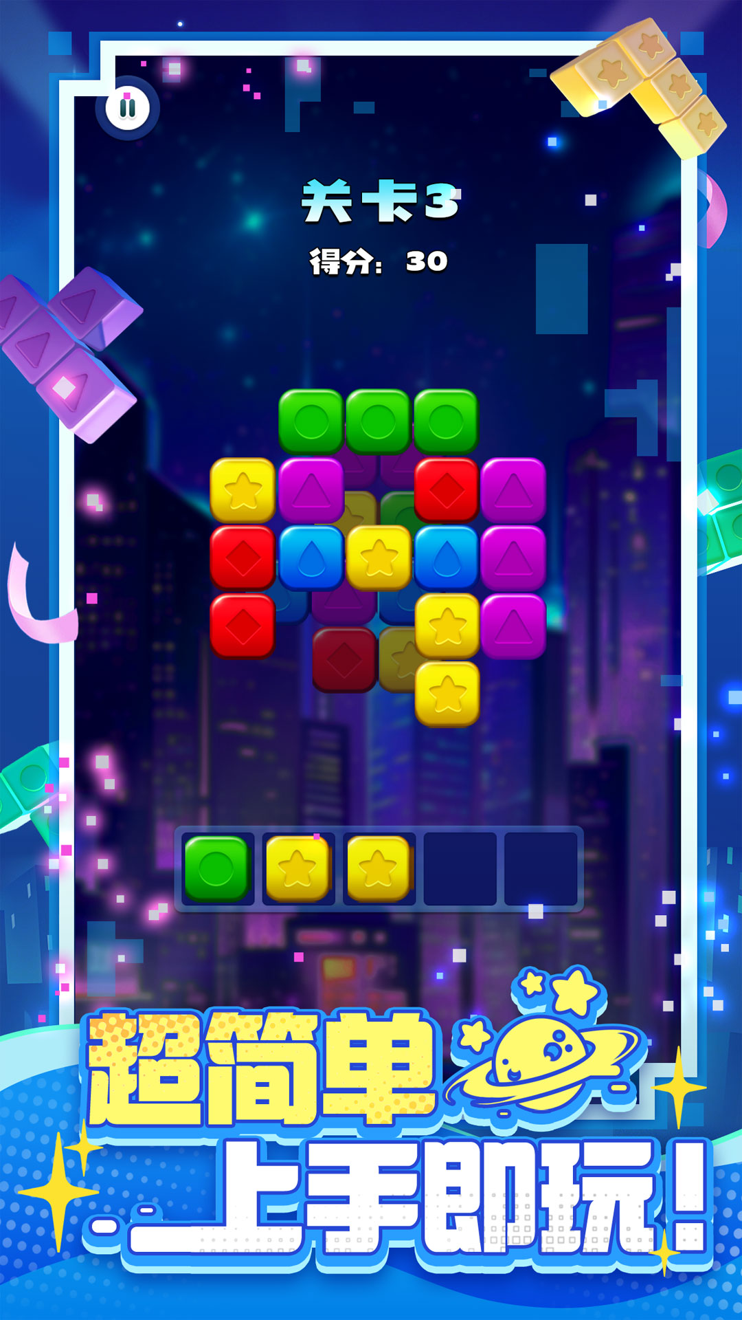 点击2个或更多颜色的星星方块即可消除,同色的星星方块越多,得到的分数越多,上手毫无压力。快来下载体验,还原消消之星除方块的真实的乐趣