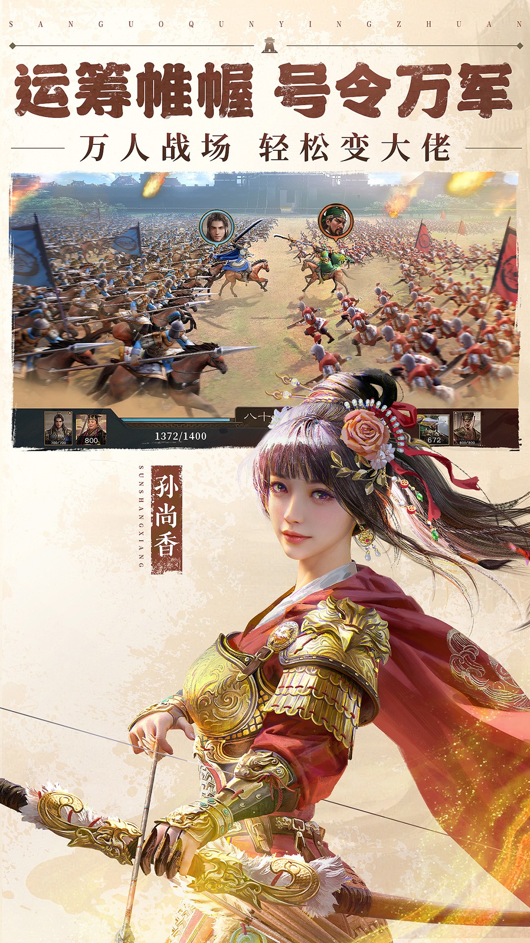 在这里你可以运筹帷幄,指挥千军万马!让你体验到高品质的、真实的三国战场。百万沙盘之上,方寸之间尽显谋略,奇诡的谋士们尽情施展才华,斩将夺旗,尽情展现英雄本色。