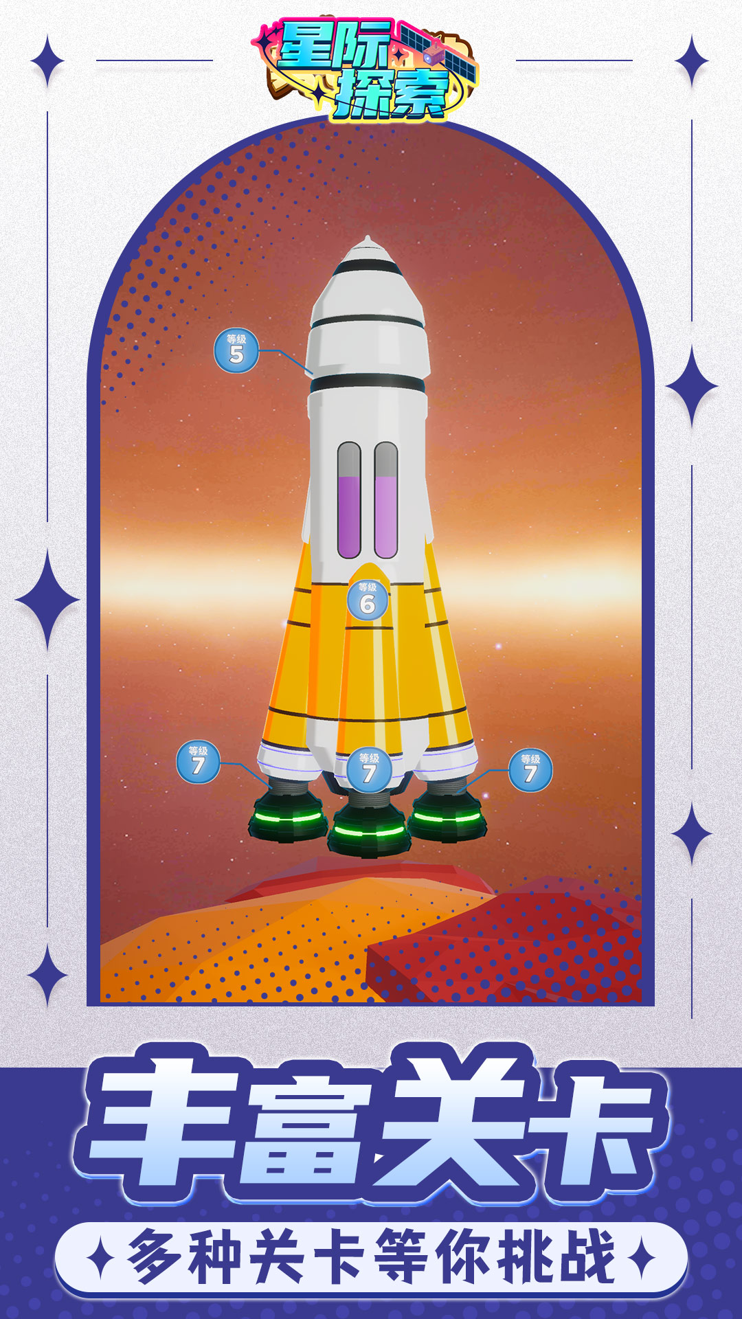 《星际探索》是一款模拟火箭发射休闲小游戏。玩家可以通过购买新模块并合并它们以升级更强大的火箭,使火箭可以飞行更远到达新星球。快来一起制造你的火箭,去太空探索新星球吧!