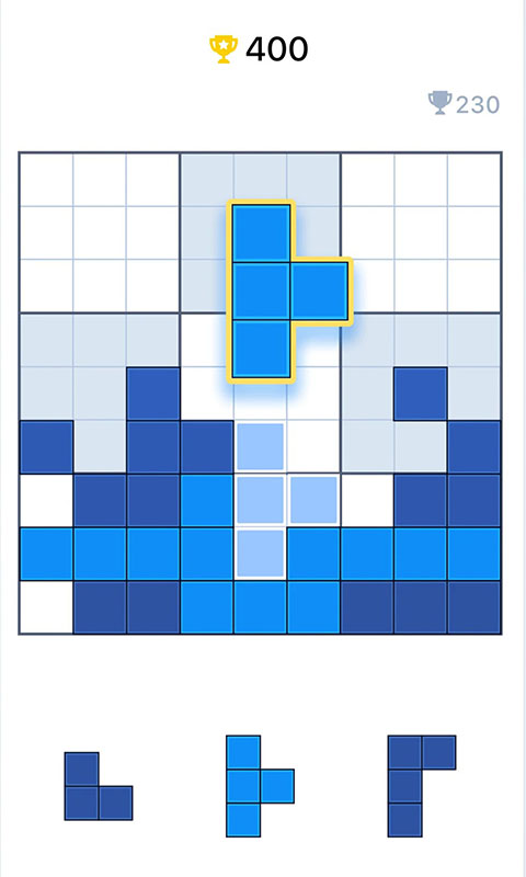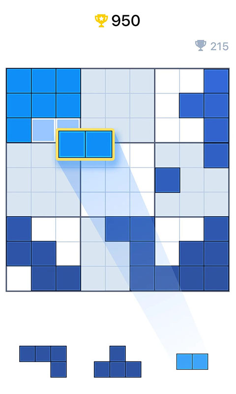 把积木方块放置于九宫格的面板之上,一旦方块将某一行、某一列或者某个九宫格填满的时候,这些方块就会被消除,同时还能获得分数哦!