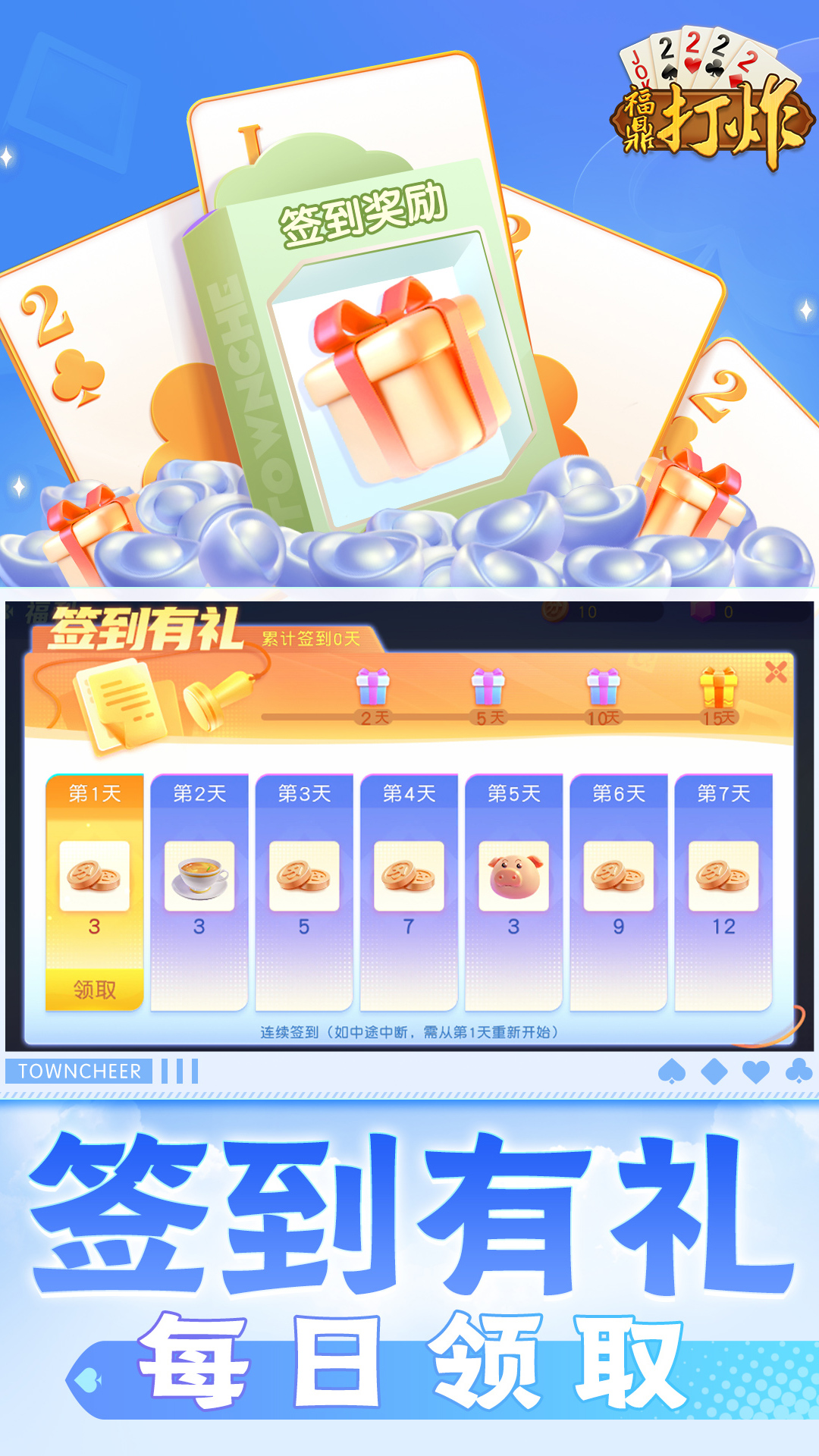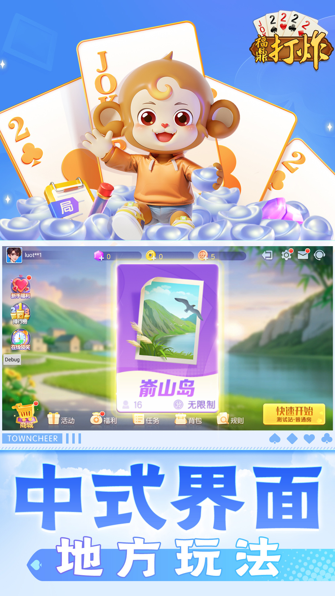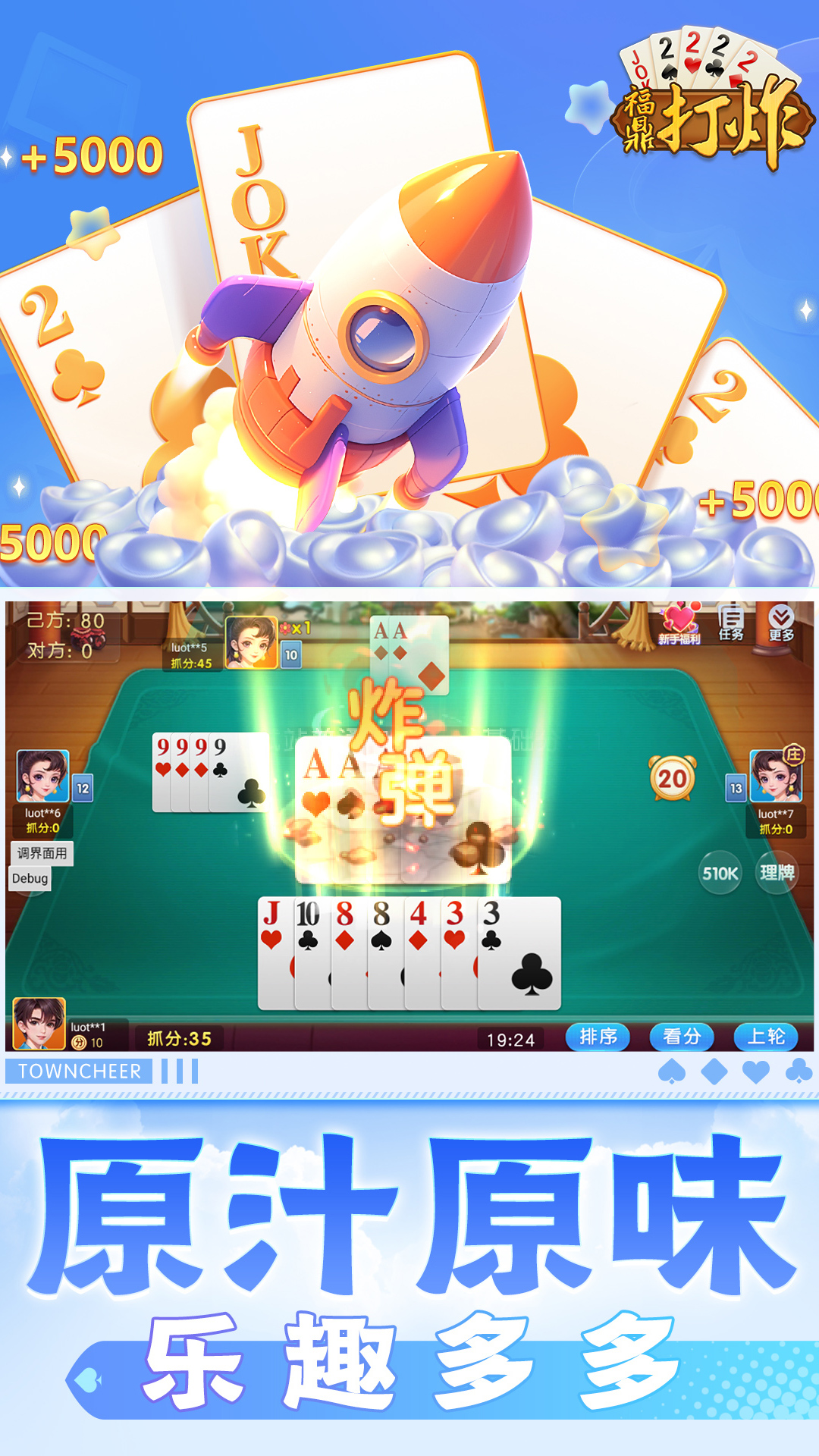 同城游福鼎打炸是起源于福建福鼎的跑牌类扑克游戏,颇具当地特色,在宁德及福建各地都较为受欢迎。游戏使用2副牌,共108张,4个人玩,每人27张。牌型有单牌,对牌,三同张,单顺,双顺,三顺,510K,炸弹。单顺,双顺,三顺不可包含2。牌张大小为大王>小王>2>A>K>Q>J>10>9>8>7> 6>5>4>3。正510K>副510K,正510K之间不同花色大小一样。游戏发牌按逆时针顺序,第一局随机决定先给谁发牌,以后每次先给上局第一名发牌。开始时翻一张牌随机指定拥有该牌的2名玩家为朋友,而获得随机翻牌的玩家A先出牌。福鼎打炸按逆时针顺序出牌,首家出牌可以出规定内的任何牌型。每当有玩家打出带牌分的牌后,桌面的牌分则相应增加,多个玩家打出带牌分的牌则累积桌面牌分;直到有玩家收分,则桌面牌分清为0。当其中一个队伍的两位玩家全部出完牌时,游戏结束,根据场上抓分进行结算。