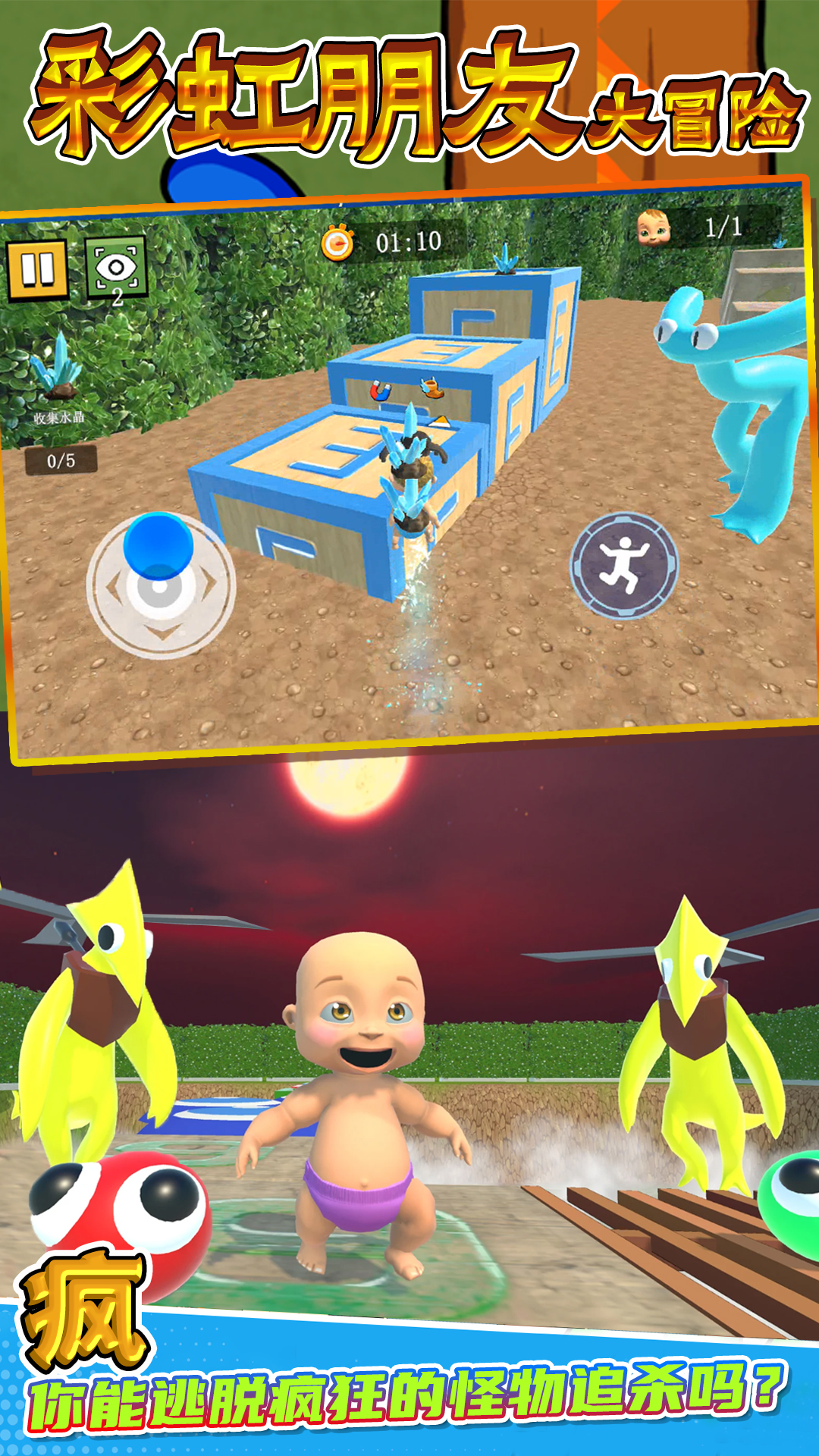 《彩虹朋友大冒险》是一款玩法新鲜有趣的冒险解谜闯关小游戏,玩家在这款游戏中扮演逃生角色,在逃生过程中,如果您不想被打败,就必须躲避怪物和爸爸。你的任务是收集所有物品,并在有限的时间内将它们带回避难所