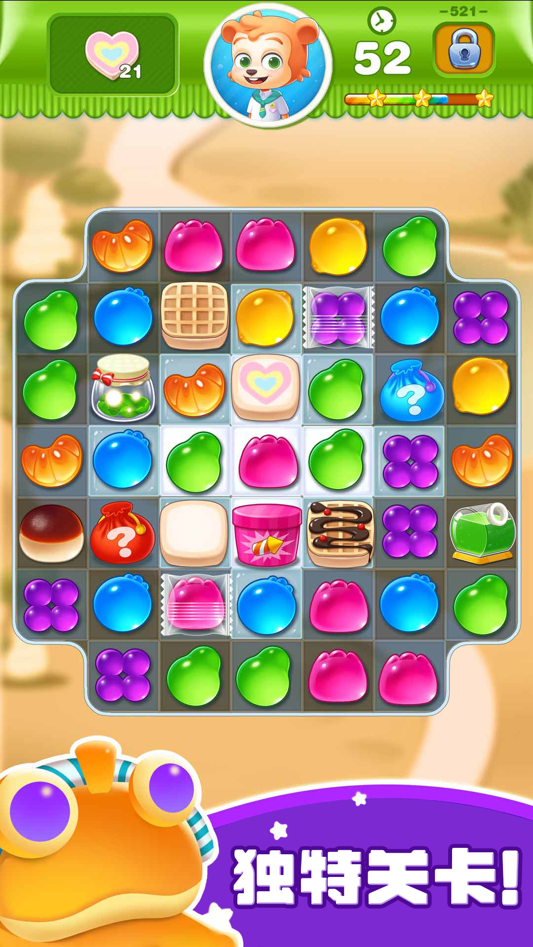 《糖果世界传奇》一款甜蜜可爱的糖果题材消除游戏。在一次露营活动中,主角莫蒂偶然通过神秘的传送门,来到充满幻想的糖果世界,展开一段不可思议的旅程!经典三消玩法的再次升级,动动手指即可体现前所未有的畅快体验。跟随莫蒂闯荡天马行空的糖果世界,探索各个奇妙的大陆,收集可口软弹、酥脆饼干、寻找各种口味的雪糕、操作奇妙的糖果机器。无需联网随时畅玩,完全免费杜绝胡乱扣费,赶紧下载,创造属于自己的《糖果世界传奇》吧!