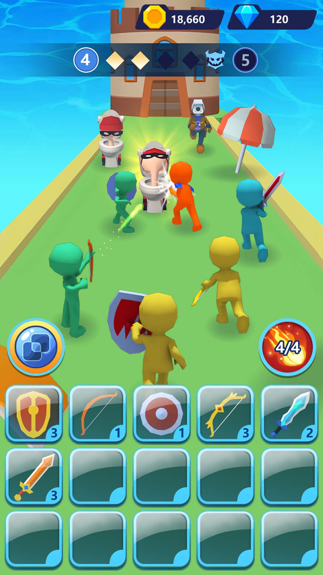 这是一款创新的战斗策略游戏,玩家需要通过将同等级的小兵合成,得到更高等级的士兵,然后派遣这些士兵出击,攻击敌军。