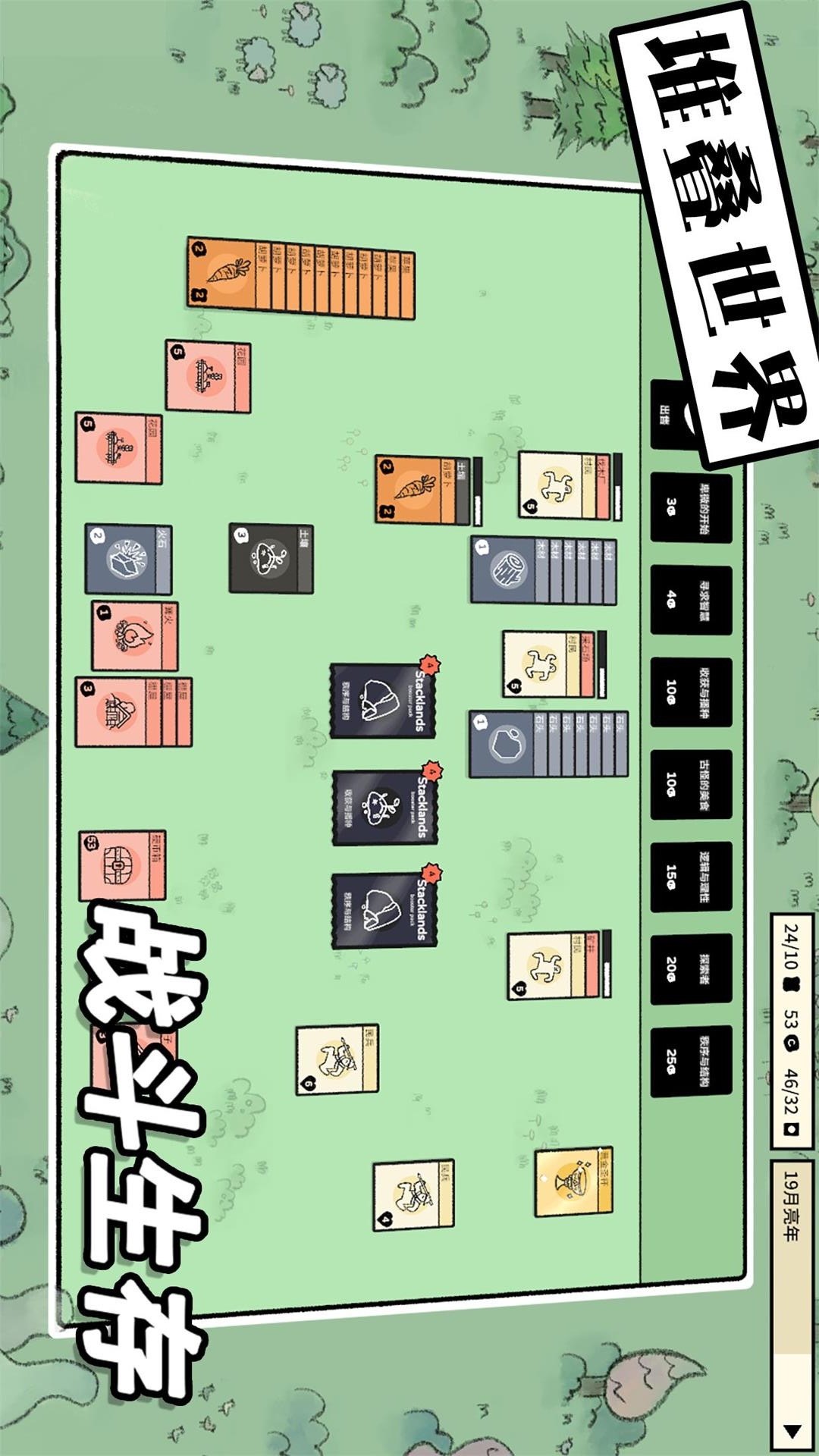 《堆叠世界》是一款村庄建设游戏,你可以在那里堆叠卡牌以收集食物、修建建筑、并与各种生物战斗。 例如,将“村民”卡牌拖至“浆果灌木”顶部将会生成“浆果”卡牌,村民们可以吃这些浆果卡牌来生存!秀出好你的卡牌,扩建你的村庄!