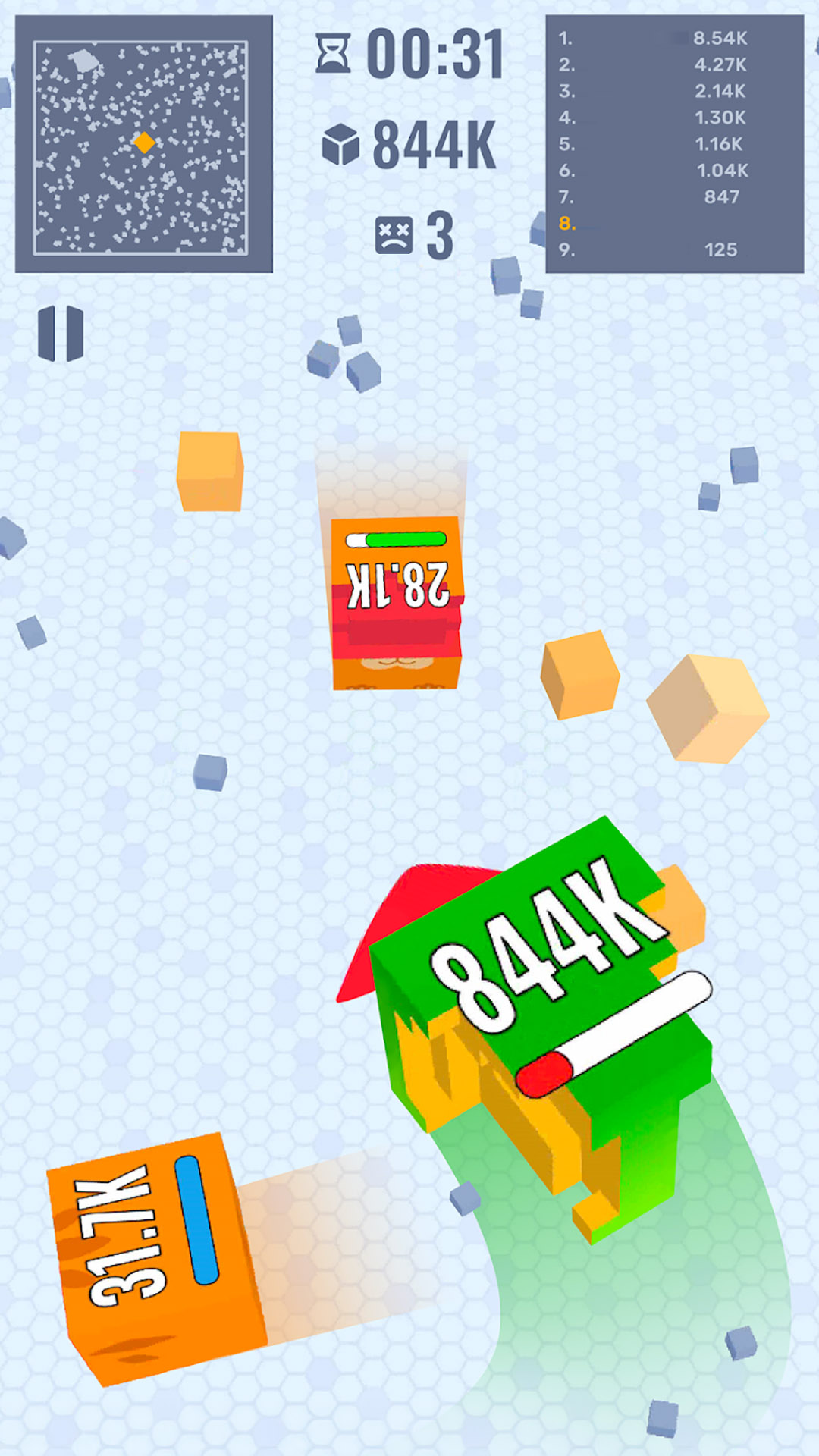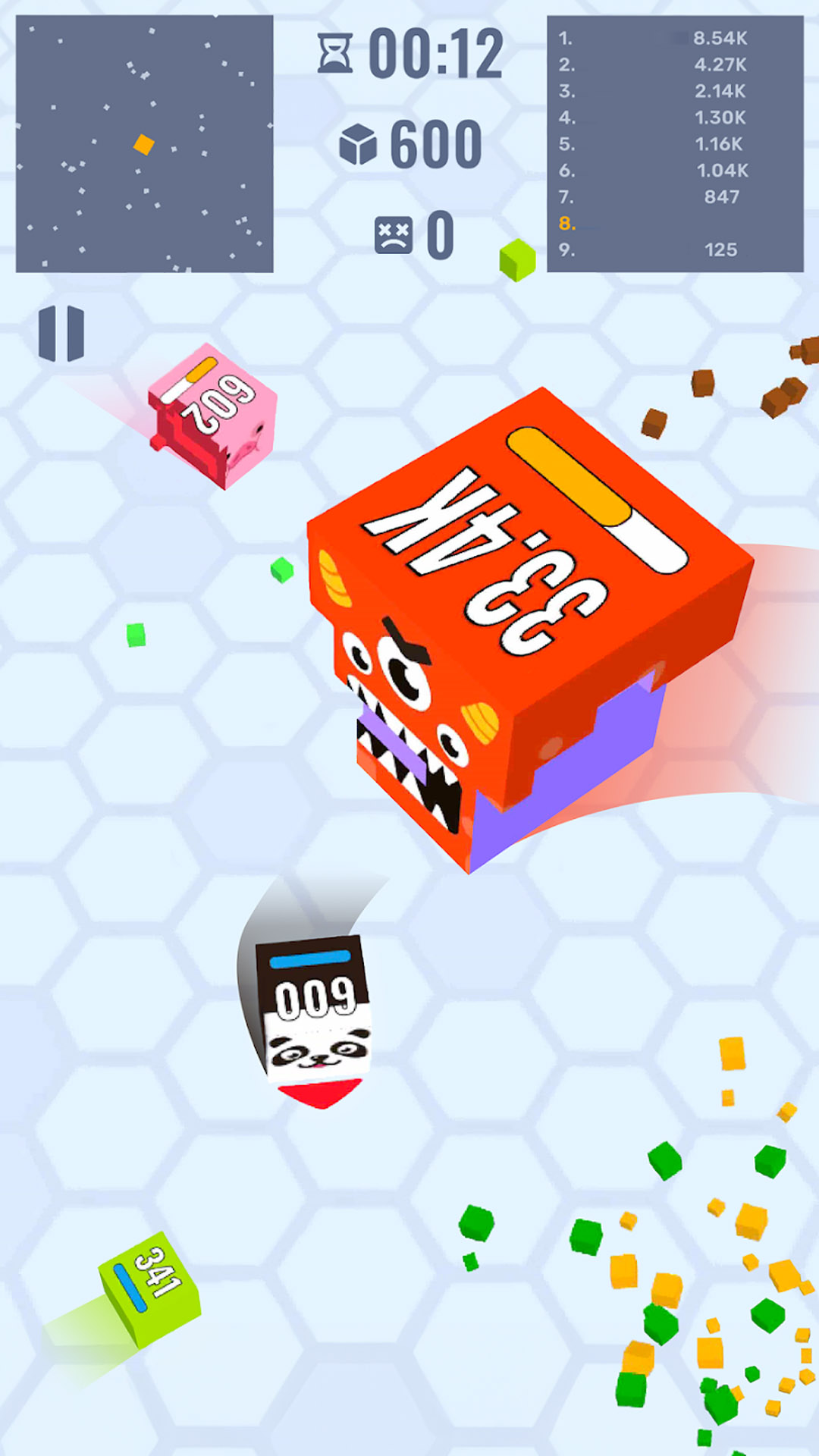 在这里,你是一个可爱的方块,你需要在一个庞大的竞技场中展开竞技,你需要收集较小的方块,每吞噬一个方块后,本体就都会变得更大。但是要当心,你的对手随时潜伏在每个角落。在竞技场中还会散落功能各异的道具,你需要重复利用道具来壮大自己。采集的每一步策略都将使你更接近更高的水平并主导竞技排行榜。