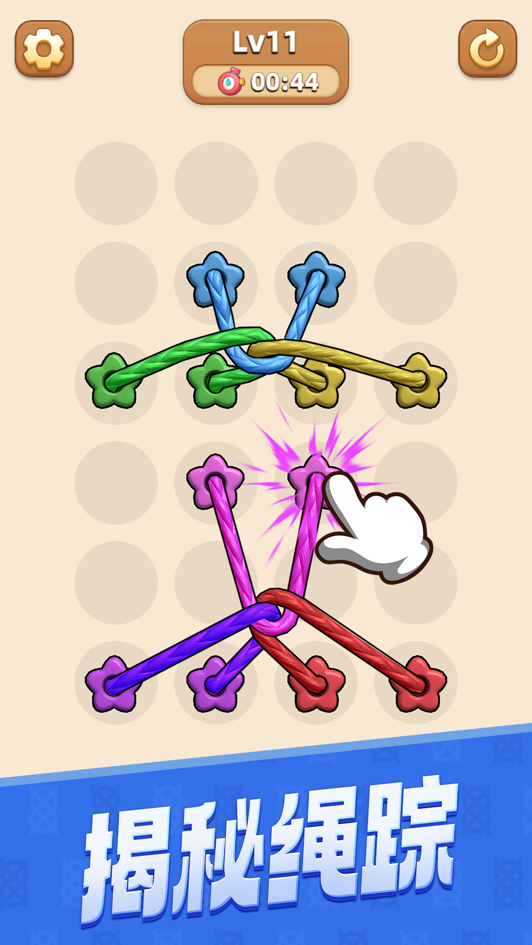 将各种扭结在一起的绳子逐一解开,让绳子间没有交叉即可顺利通关!没有时间和步数的限定,你还能挑战成功吗?
