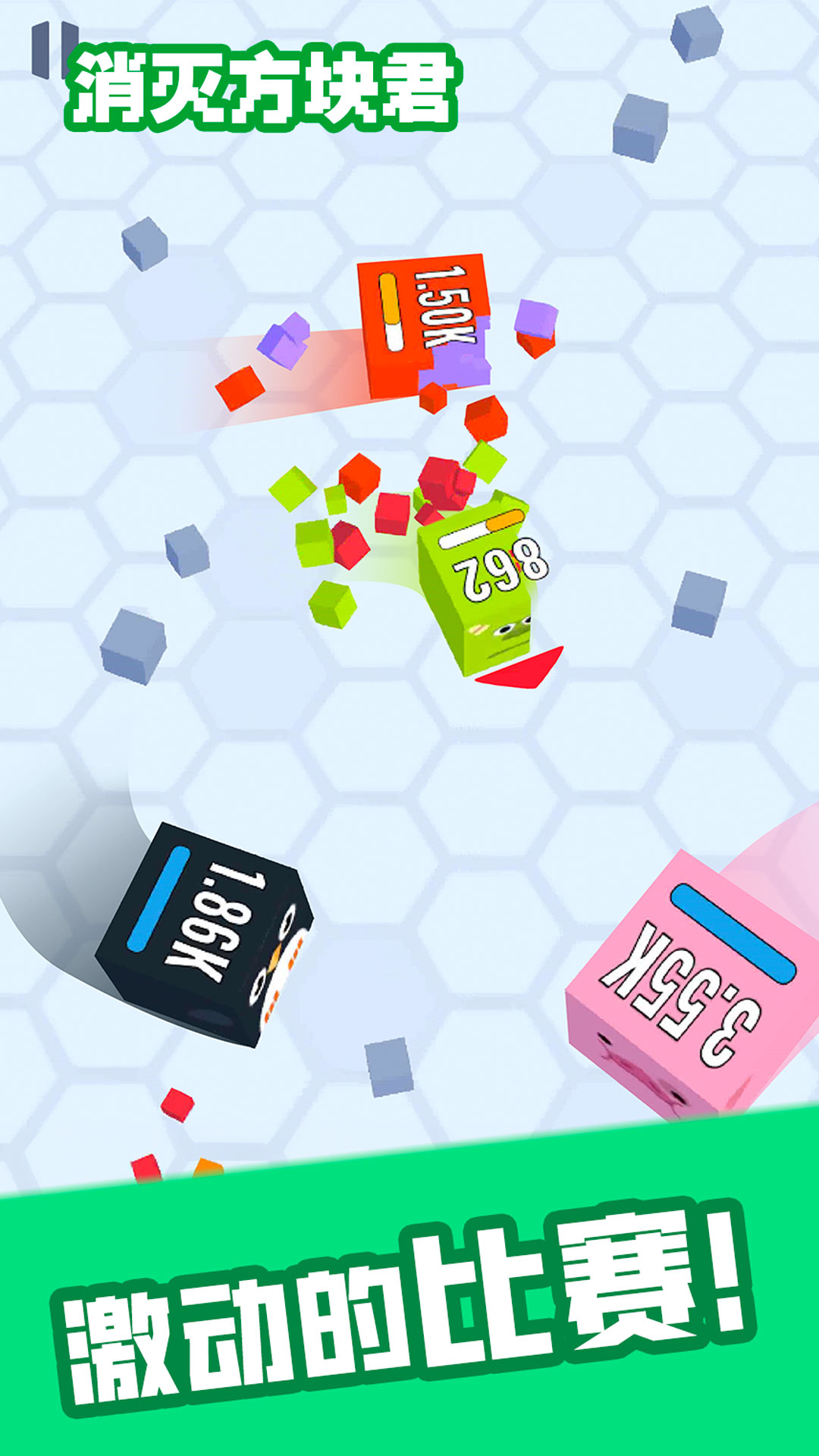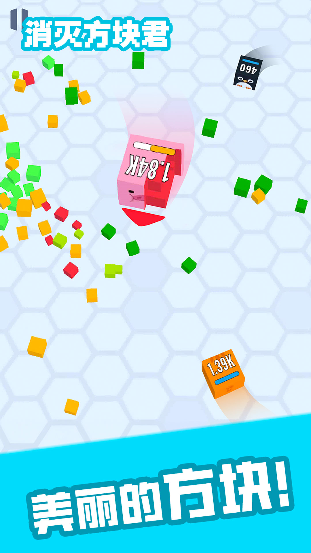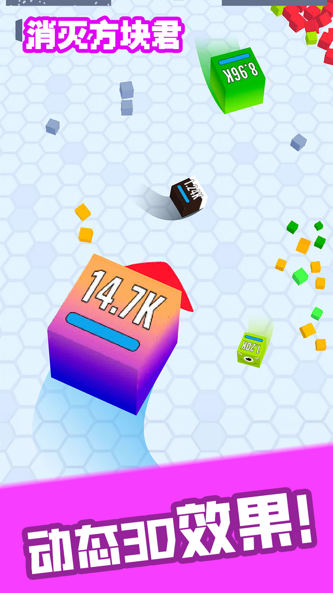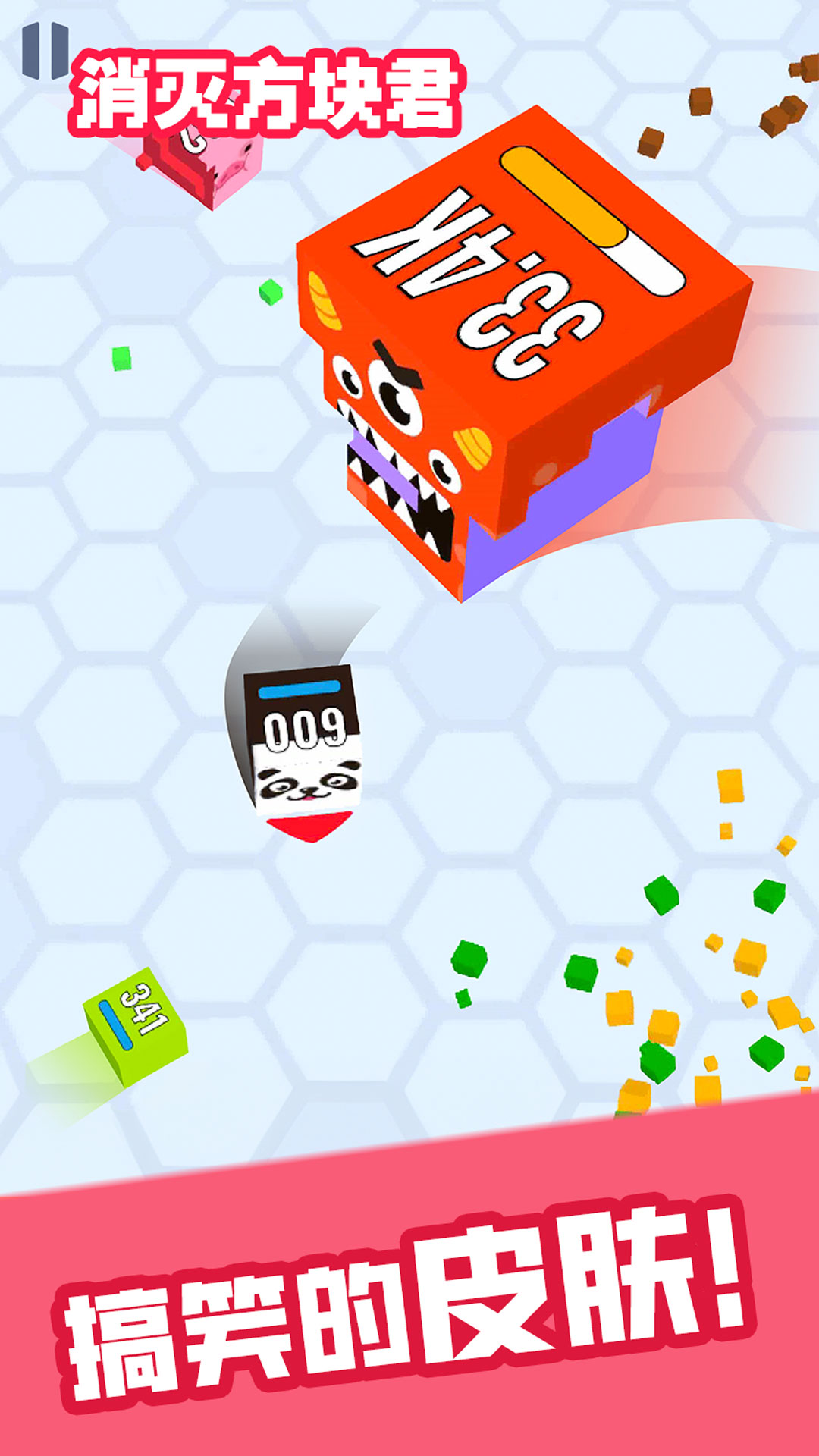 游戏中,玩家将操作一个可爱的小方块,在一个3D竞技场中和其它方块比拼。游戏的规则简单而有趣,不断收集较小的方块,从而变大,同时也要注意躲避比你大的方块来袭。击败对手可以获得金币奖励,一定数量的金币可以解锁有趣而时髦的皮肤,快来立即下载,您一定会玩得很开心!