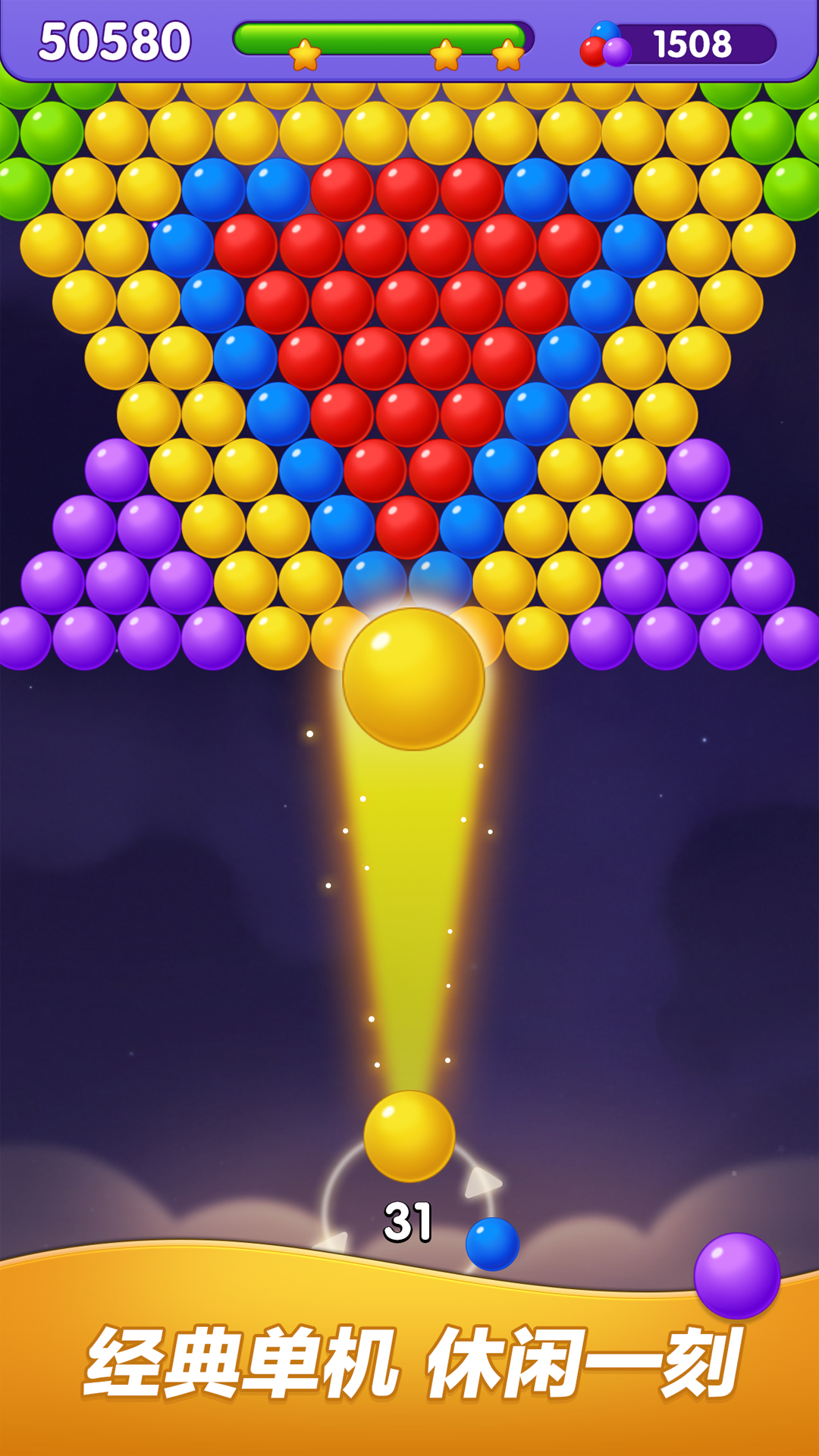 玩家要发射泡泡,使相同颜色的三个及以上泡泡相连从而消除。玩法虽简单,却很讲究策略。比如观察泡泡分布,找关键突破点。它不仅有趣,还能锻炼手眼协调、反应和思维能力。