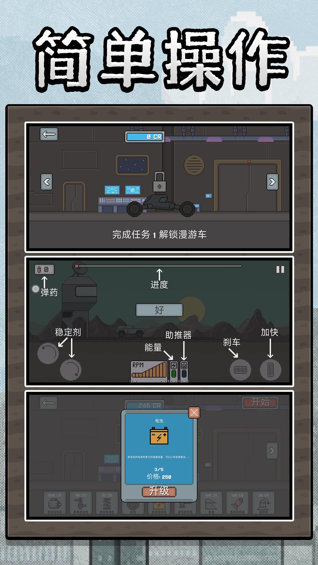 一款非常有趣的赛车闯关小游戏,在游戏中你将体验到不一样的赛车新玩法。你需要控制一辆装满武器的小车不断前进,路上你要消灭掉所有的敌人,利用你车上的武器。你将在各个星球上冒险生存,并且你可以升级你的车辆,让自己更强。