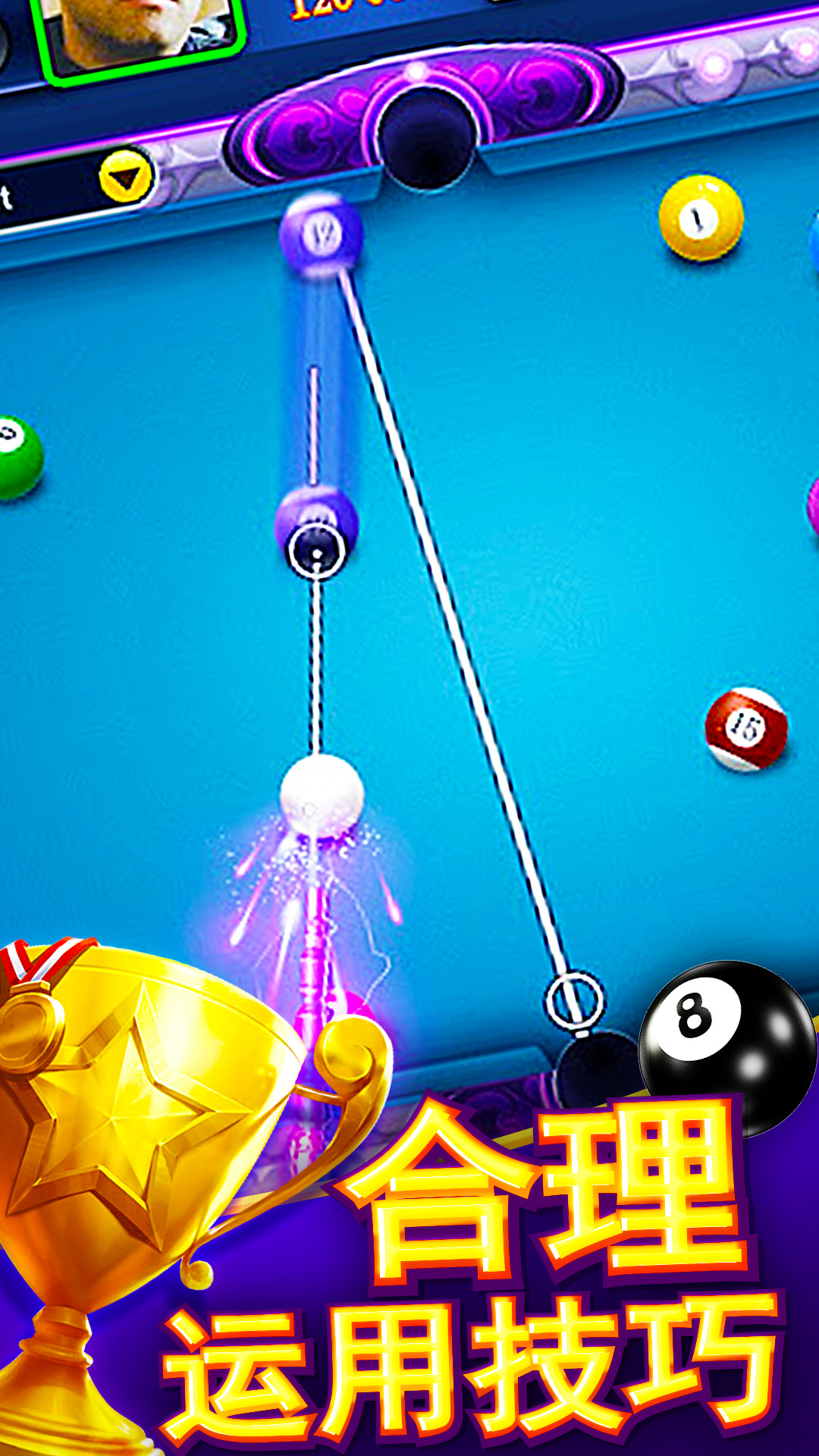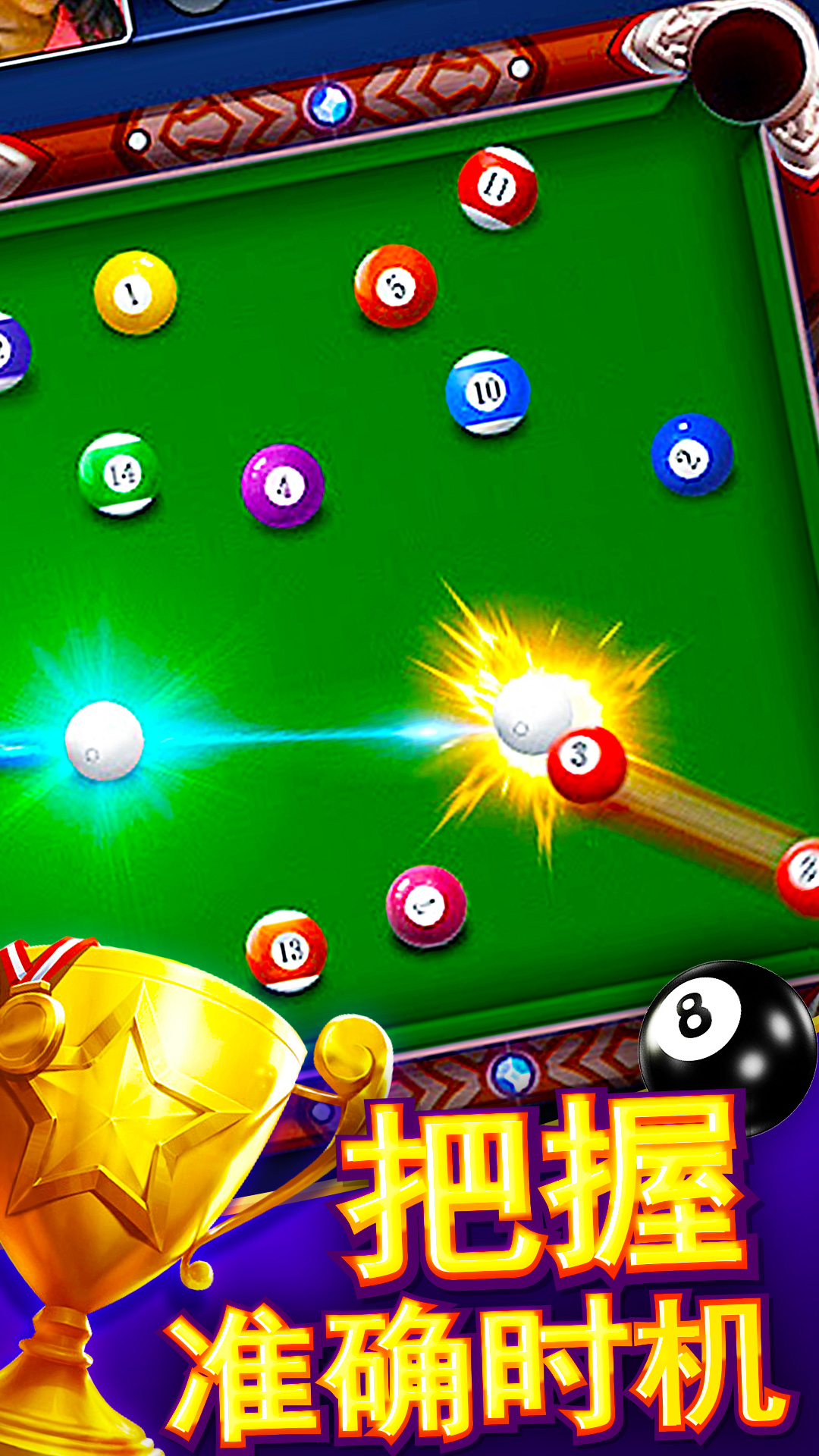 模拟真实的物理原理,体验经典的桌球游戏! 游戏还原了真实的8球玩法,简单易上手的操作方式,配以炫酷的动画特效,加上激动人心的赛事。我们在线上为广大球友准备了一个丰富多彩的桌球竞技世界。