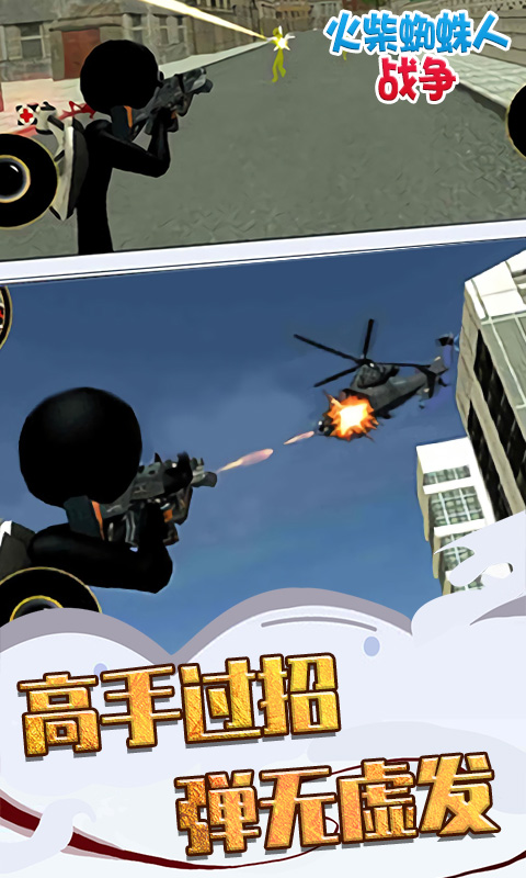 火柴蜘蛛人战争是一款火柴人题材的3D动作枪战游戏,游戏打造炫酷逼真的场景,游戏中玩家需要操控火柴人开启模式,各种空中滑索,摧毁车辆,带给你无限的刺激!