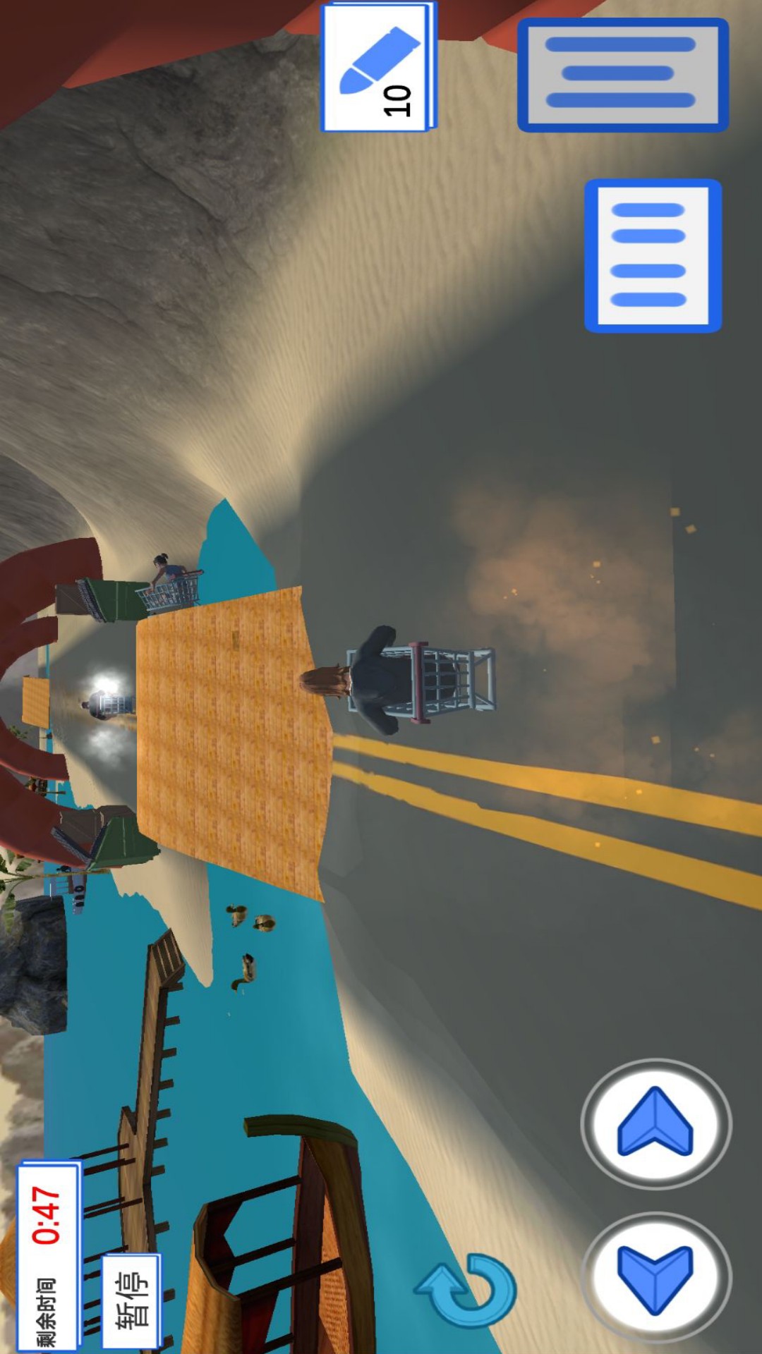你在游戏扮演一位坐在超市购物车里的懒人,体验另类竞速的快感,要赶在超市关门前安然无恙的到达,但是想要安然的到达十分的困难,还需要在路上躲避各种障碍,同时为自己和朋友收集饮料来补充体力。