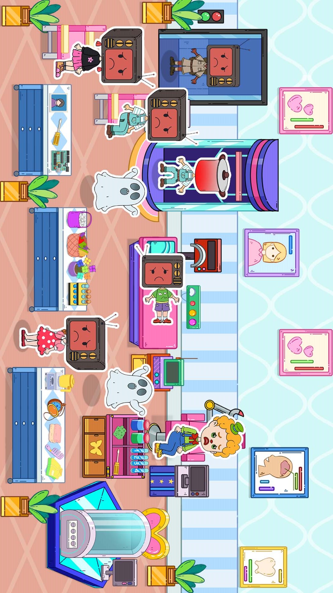 选择自己喜欢的角色,自由拖动到不同的诊室,为他们进行治疗。