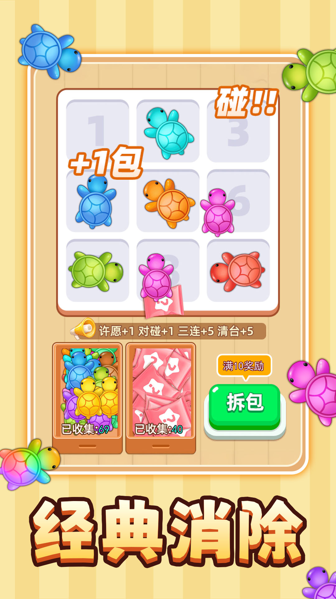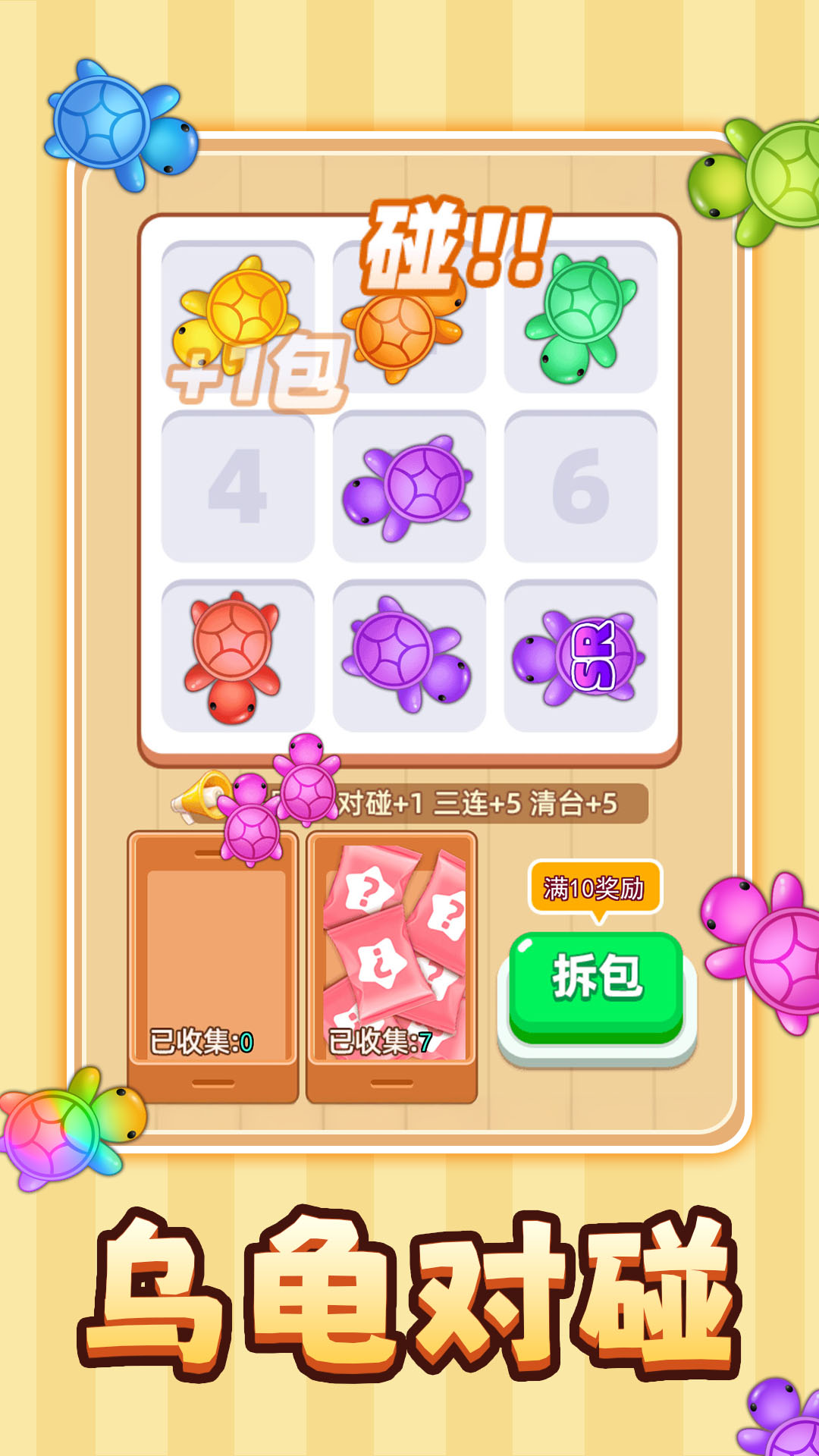 这是一款趣味性十足的对对碰闯关小游戏。没有复杂的操作和玩法,上手十分轻松。在这里玩家通过随机抽取不同的乌龟盲盒来进行消除,达成不同的碰即可为自己增加更多的抽取次数,消除更多乌龟。游戏画面色彩鲜艳,乌龟形象设计可爱,在这里不断刷新自己的分数,快来试试吧。