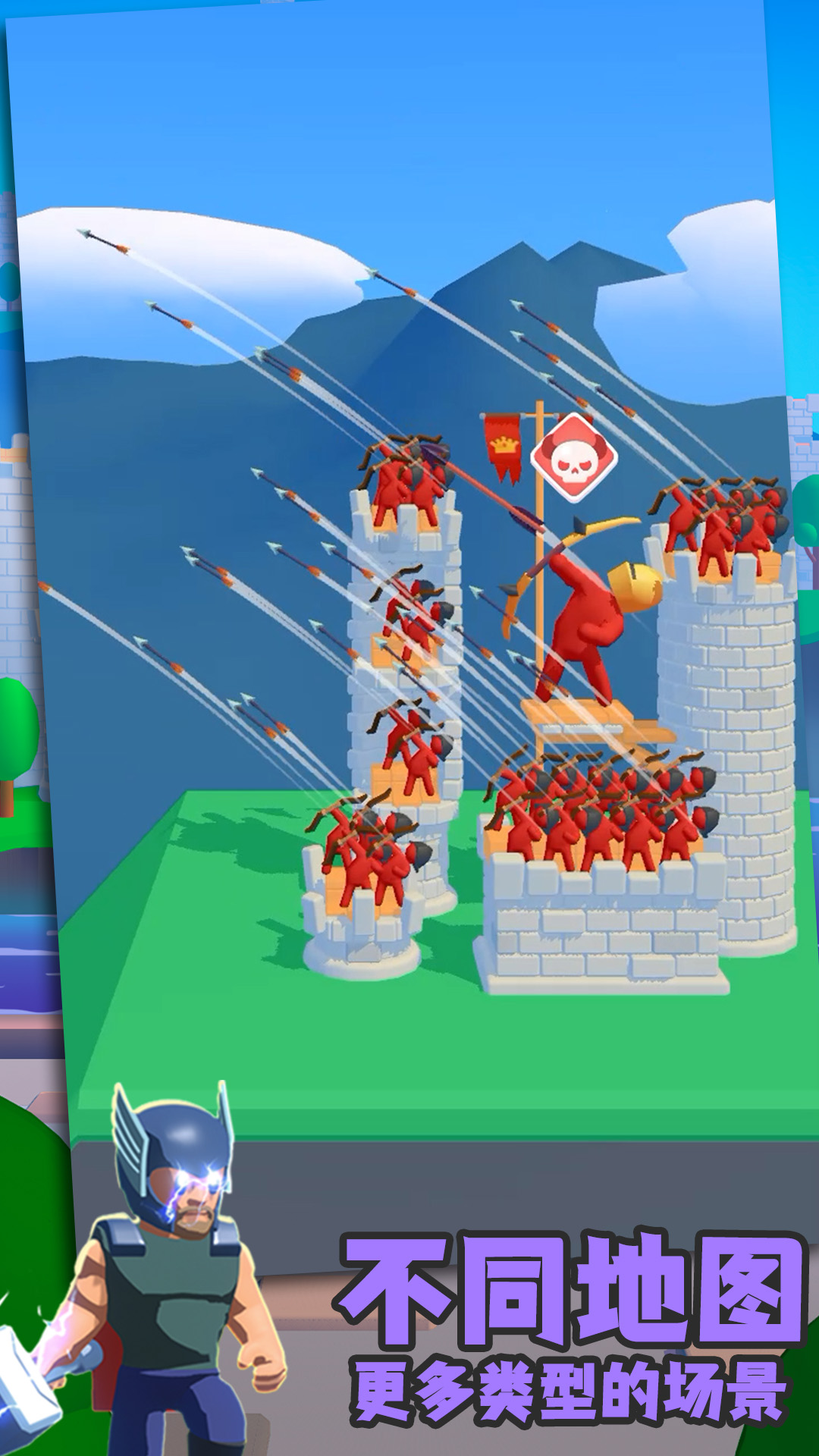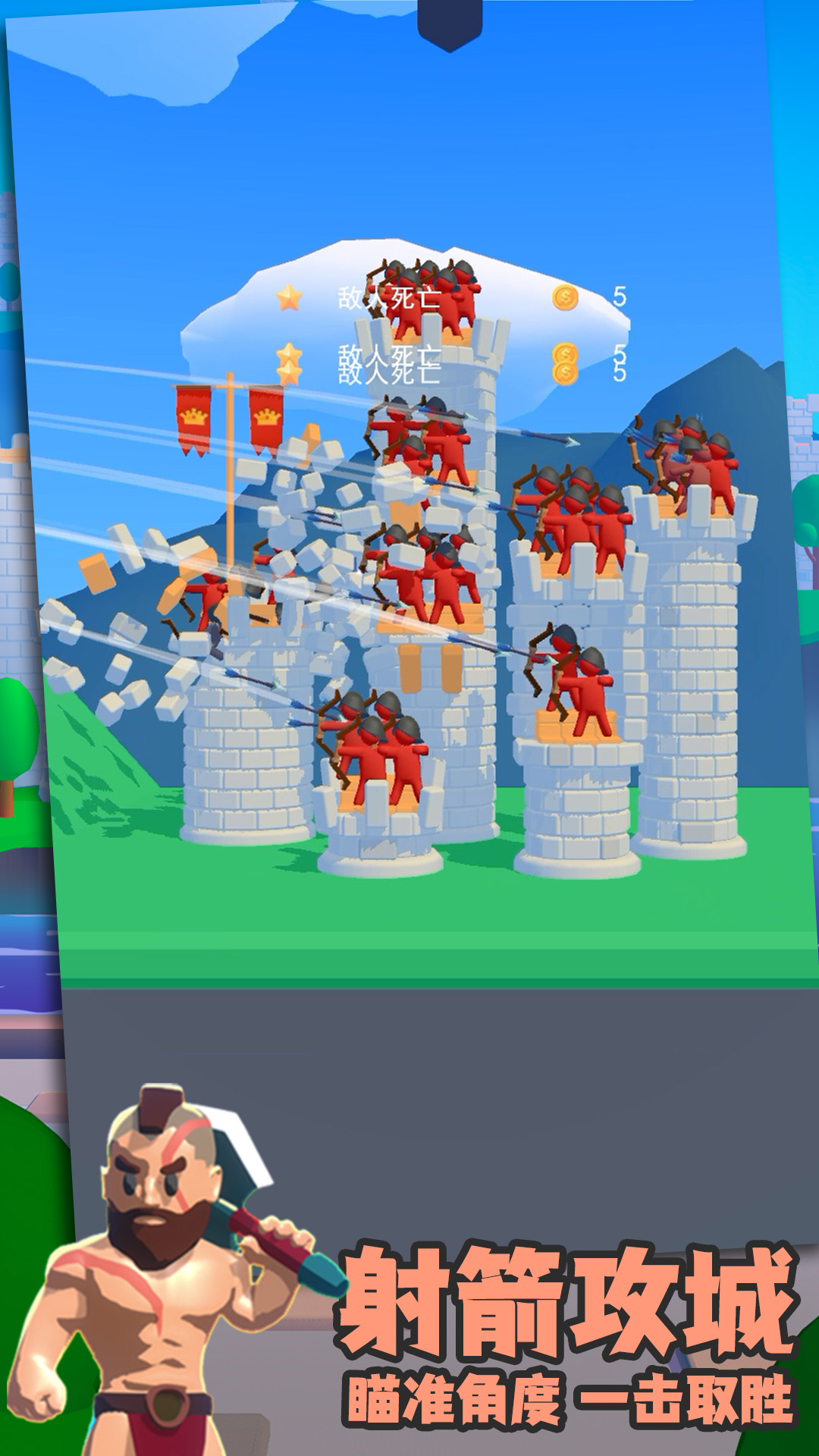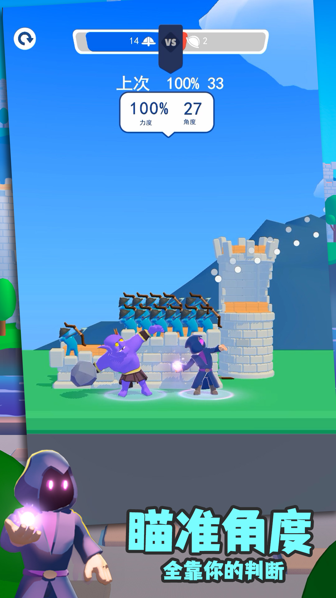 战斗开始了城堡到城堡!你必须摧毁所有敌人的弓箭手,摧毁他们的塔楼。敌军可能比你的大,塔楼更坚固,箭更具破坏性!