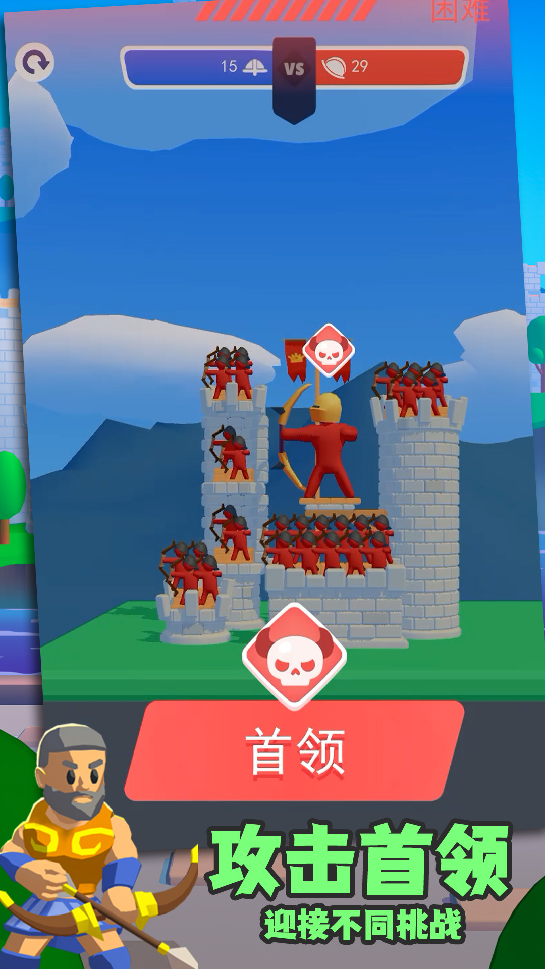 你可以使用一座有棍人弓箭手的塔,在它的帮助下,你必须占领敌人的城堡。用弓瞄准,尽量不要错过!