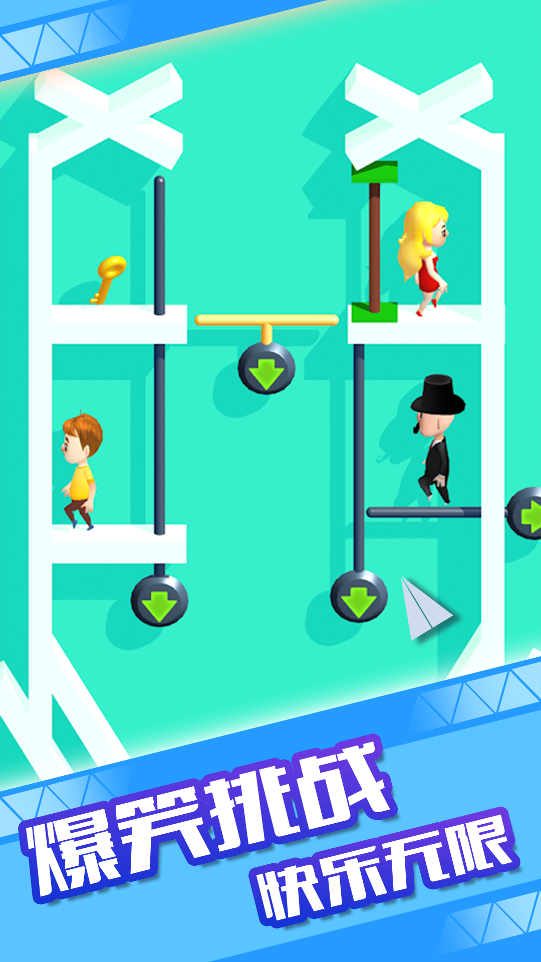 一款益智小游戏,游戏中的男主想要和女主在一起,但在找寻女主的过程中会遇到各种障碍物和坏人,玩家扮演的是男主通关跨越障碍消灭坏人之后幸福的在一起。游戏简单耐玩,趣味性较强,是一款休闲娱乐的佳品。