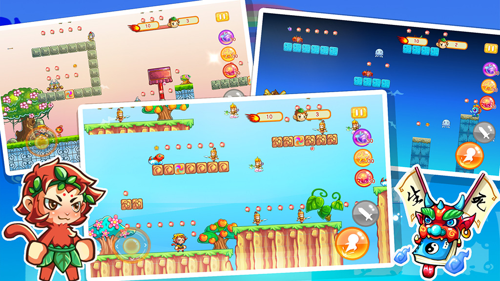 游戏操作十分简单:左下角的按钮用来控制移动方向,右下角的按钮控制跳跃和攻击动作。