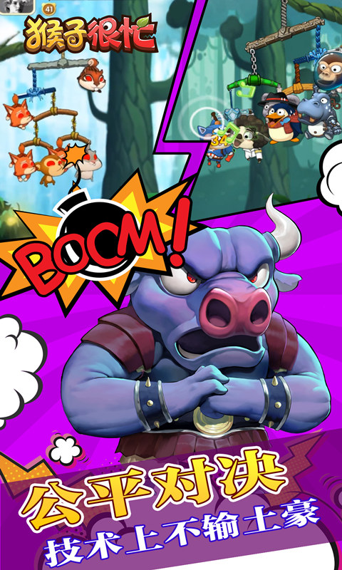 《猴子很忙》是一款2D弹射对战游戏。在这里,50多种动物、多种阵型任你搭配!每种动物都拥有自己独特的攻击手段,有一百种办法把对面打烂!策略至上的同时,打得准才是王道!排位赛、香蕉乱斗、冒险模式,玩法多的让你根本停不下来!好友对决欢乐无比,到底谁才是打的准的那个?一局对战立刻揭晓!