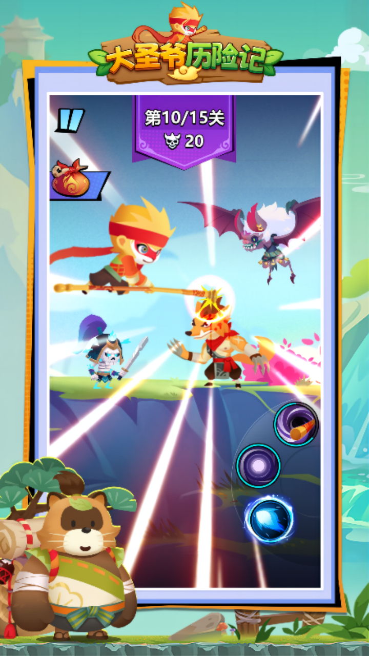 《大圣爷历险记》是一款西游题材的竖版闯关游戏,玩家将在游戏中扮演猴哥,在行走的旅途中遭遇黑熊、牛魔兽、野鸡等各类神兽的追击,通过击杀,技能解锁和升级等一系列动作消灭神兽,完成闯关大挑战,开启新篇章~