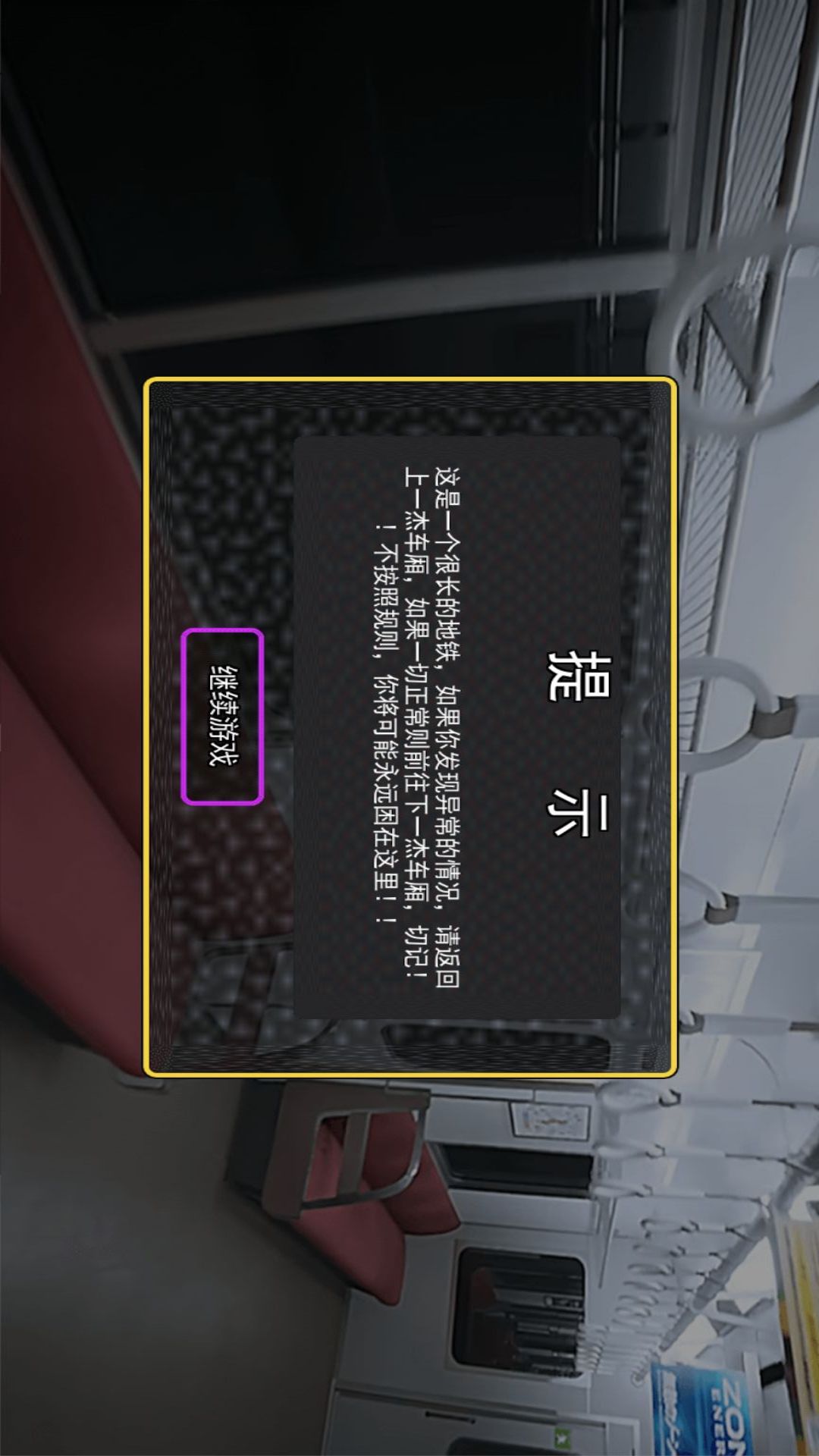 一款经典的冒险锁解谜游戏,你需要在缓缓向前的怪异的列车中不断轮回,寻找异常,然后成功通关!在无限的列车中躲避恐怖伪人,来试一试你能否无伤通关吧!