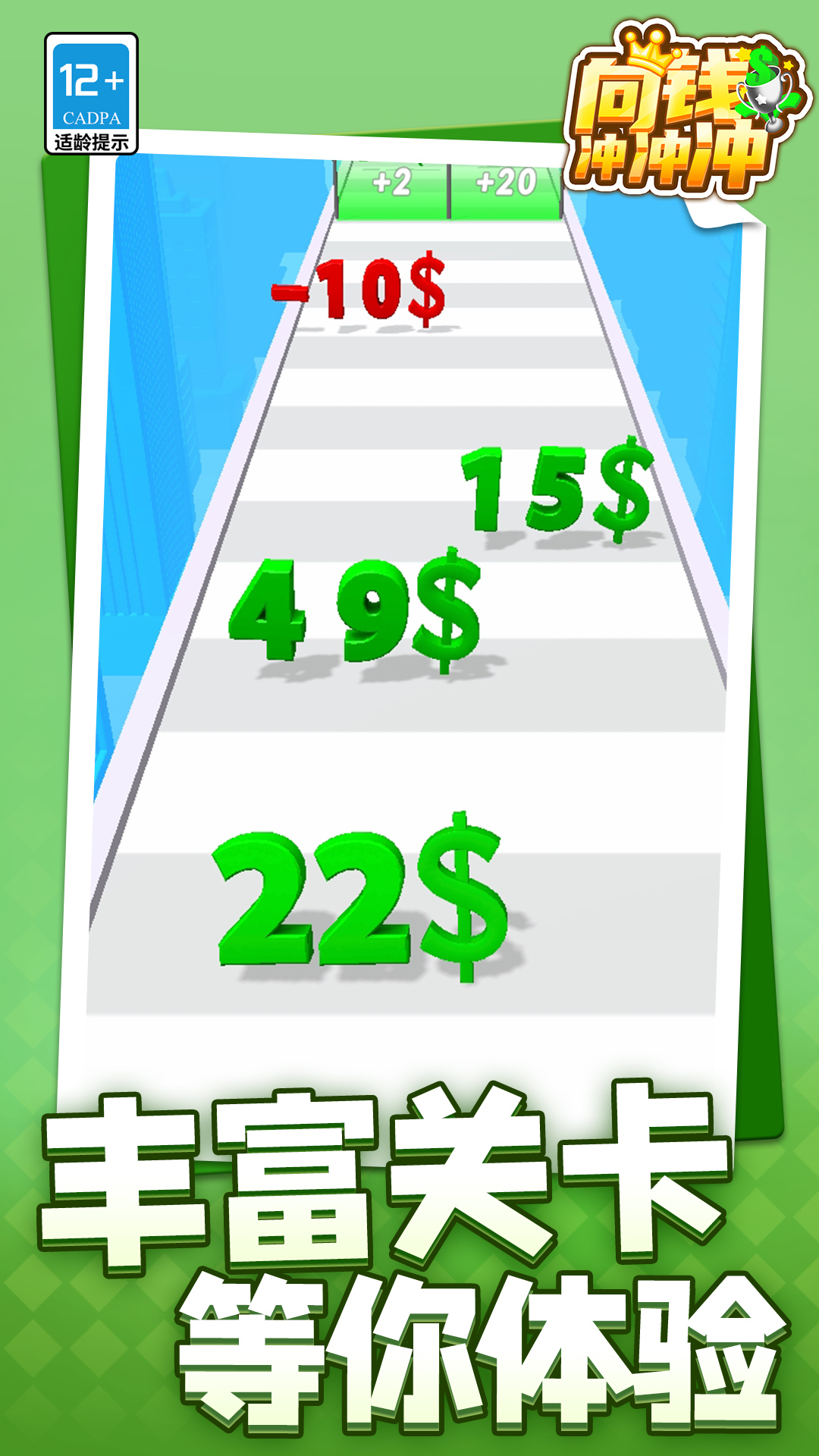 《向钱冲冲冲》是一款融合射击和跑酷玩法的游戏。在游戏中,玩家需要操控由金钱化成的武器不断向前,选择不同的门来进化升级你的武器,以达到更远的距离,完成跑酷射击的挑战。