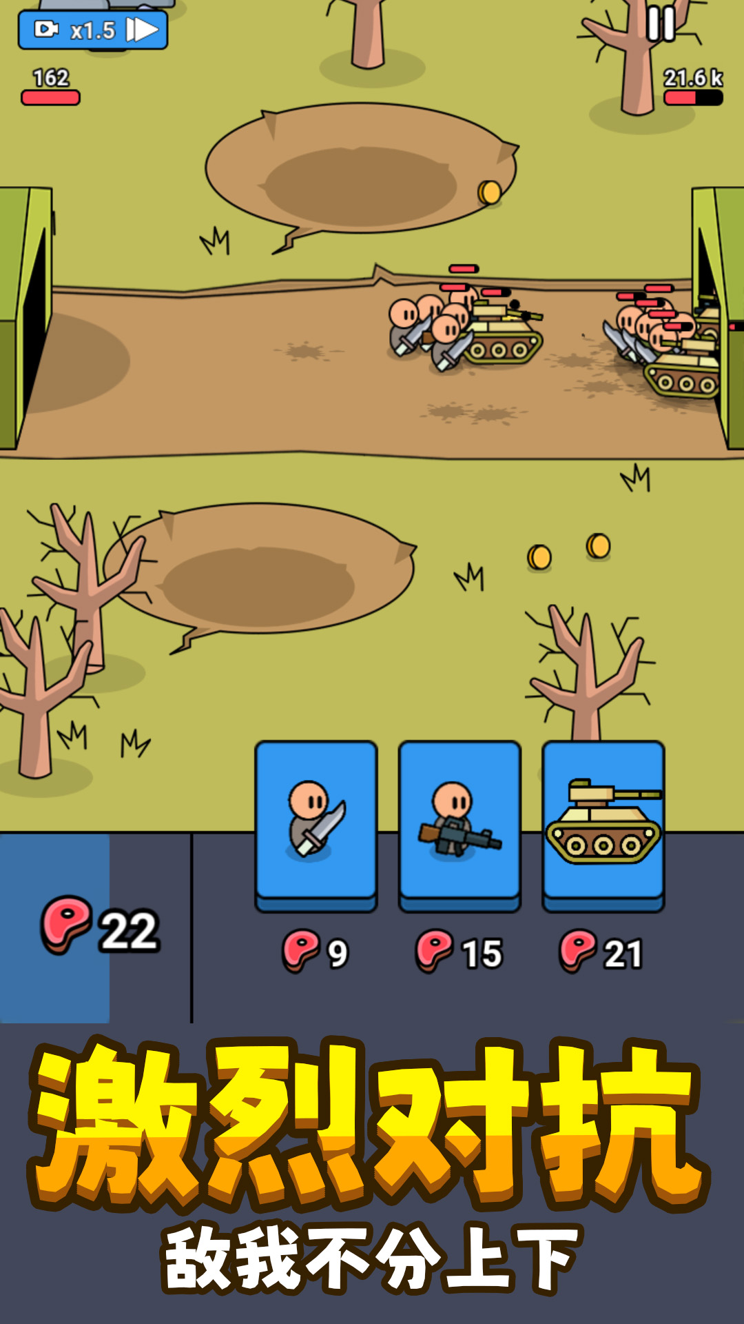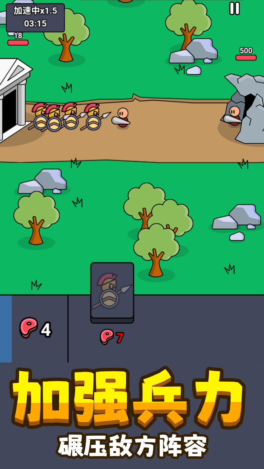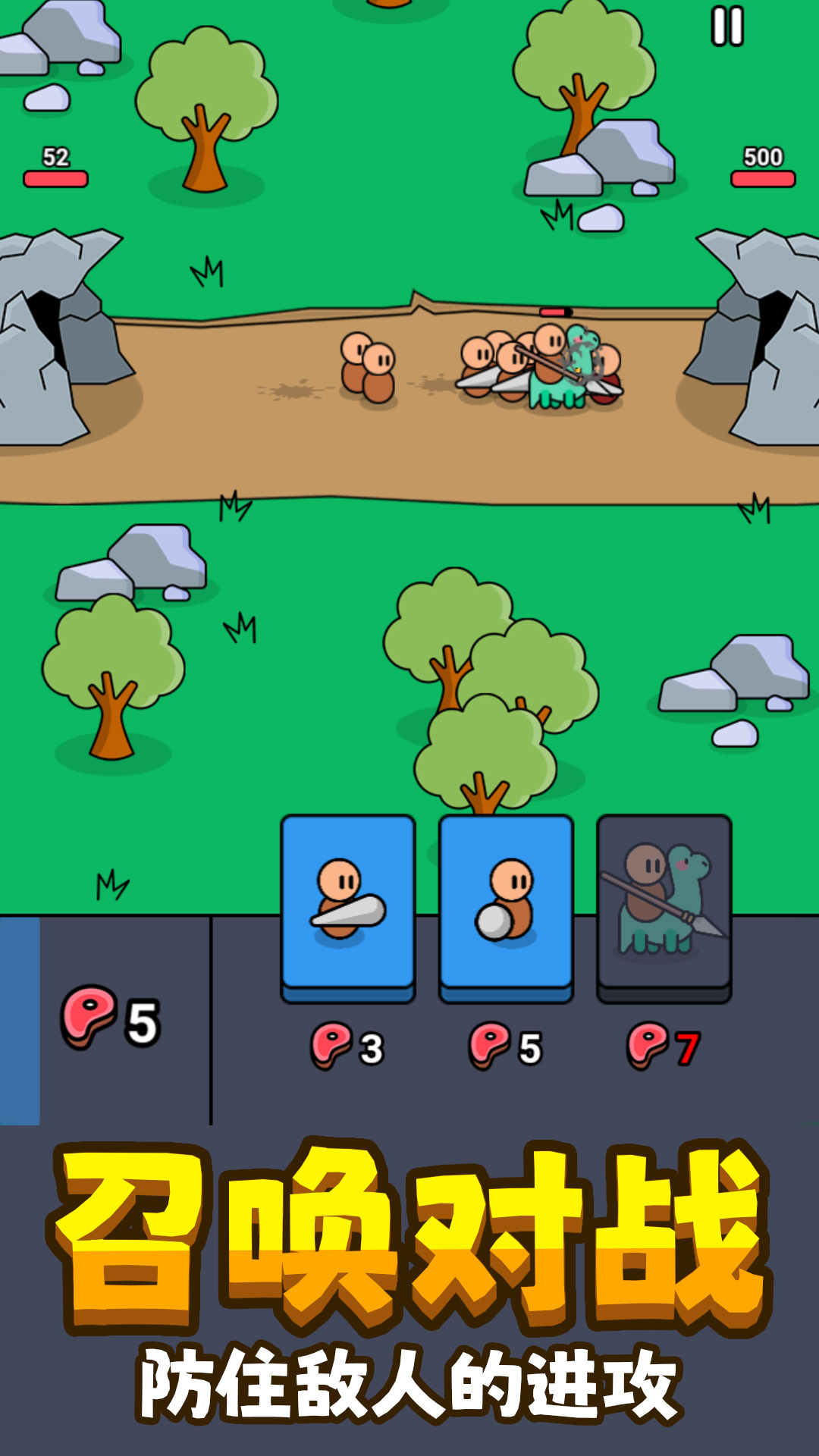 一款策略游戏,玩家将进行从石器时代逐步演变到未来文明的对抗战争,游戏中每过一段时间会在对局中产生一个食物,点击屏幕中的兵种列表可消耗食物生成士兵,获取卡片和技能可以快速的提升士兵的攻击和血量,在副本中挑战可以获得大量奖励。