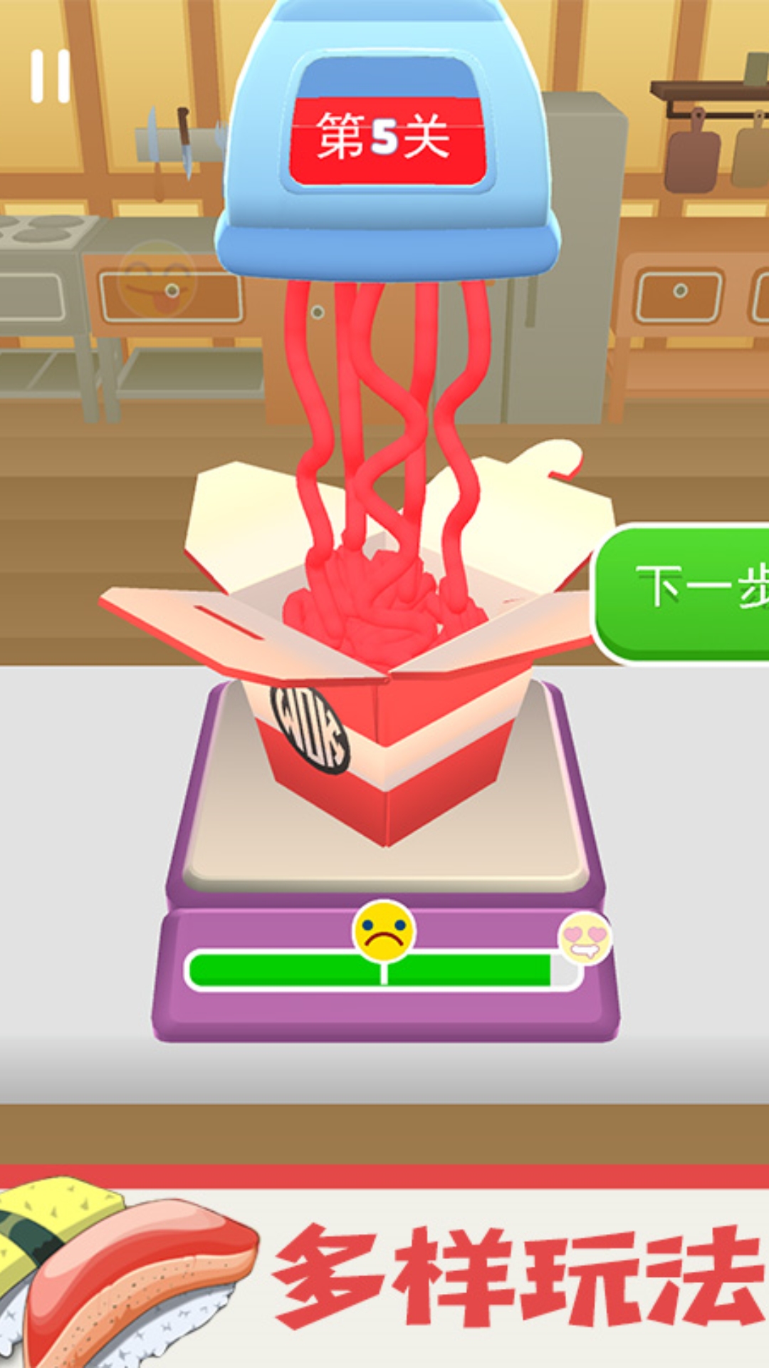 提升寿司技能,以获得更好的奖励,包括新食材,切割工具和动作。您还可以赚取更多皮肤来自定义游戏玩法!将寿司切碎,切鳞,切片鱼,炉排奶酪,做饭,在外卖盒中称量面条,以及在永不过时的各种迷你游戏中进行更多操作。使用鱼类,米饭和海藻的经典成分,并在加工过程中获得特殊的配料,包括辣椒,榴莲果和鱼子酱。结合您的选择来制作各种类型的菜肴,包括寿司,生鱼片,握寿司,面条等。
