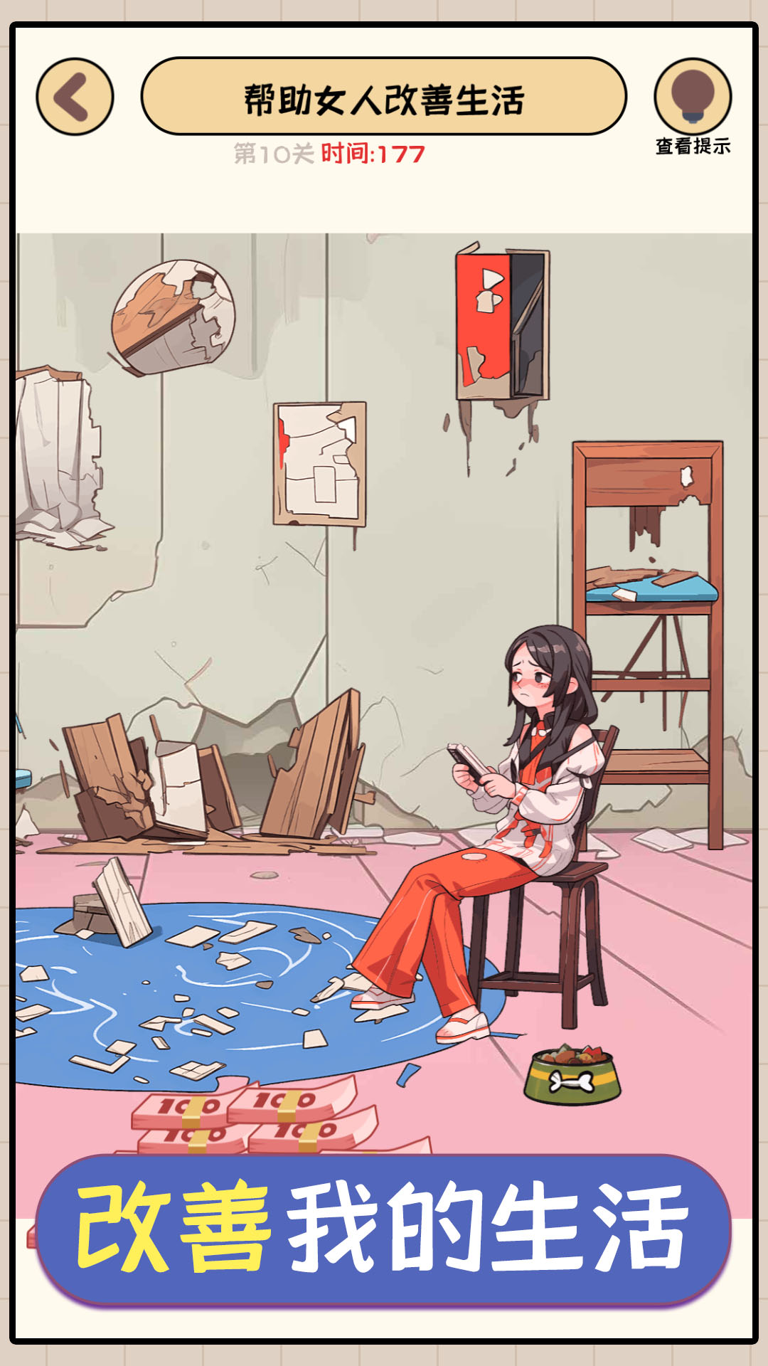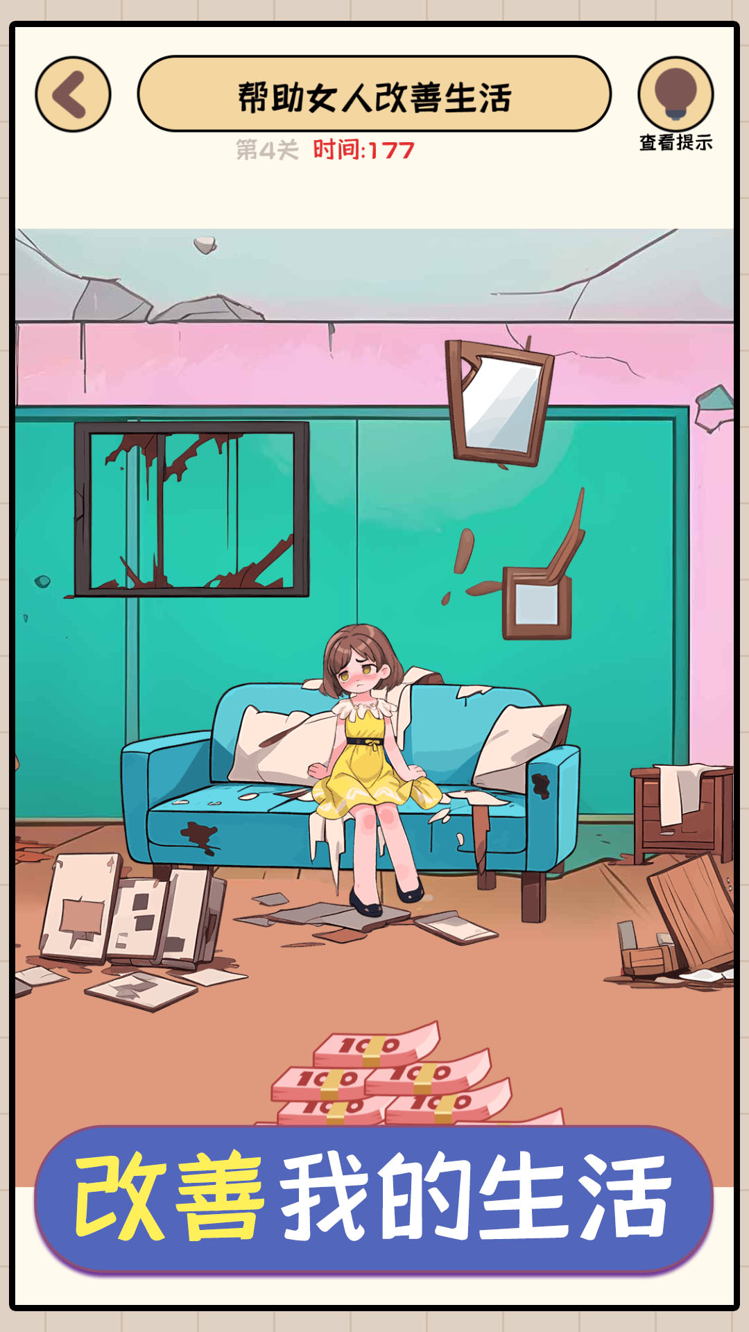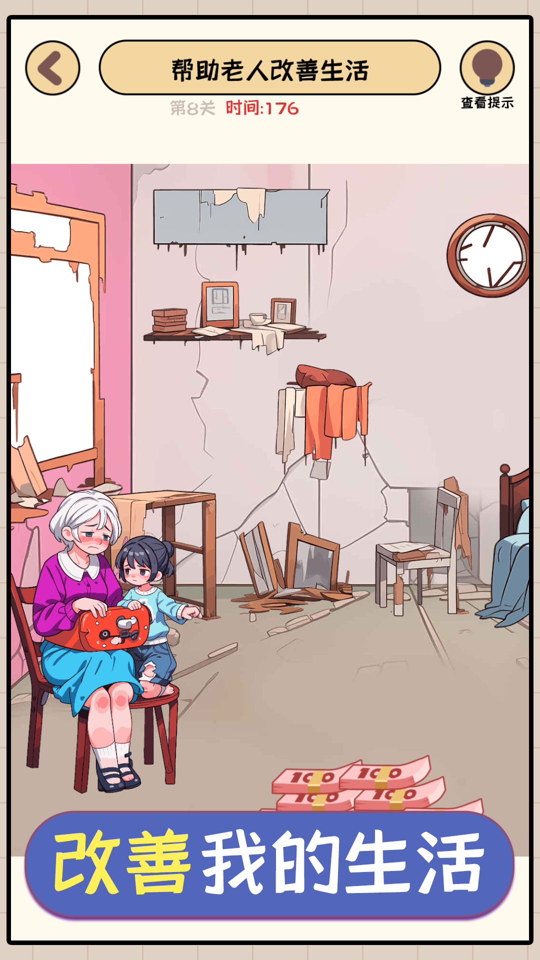 这是一款有趣的温情益智解谜游戏,游戏中需要玩家利用房间里的道具或资金修复屋子里的陈旧家具,帮助老人改善生活,使他们过上美好幸福的生活。游戏通过解开房间中的谜题,解决奶奶的贫困生活,让玩家拥有代入感和成就感。