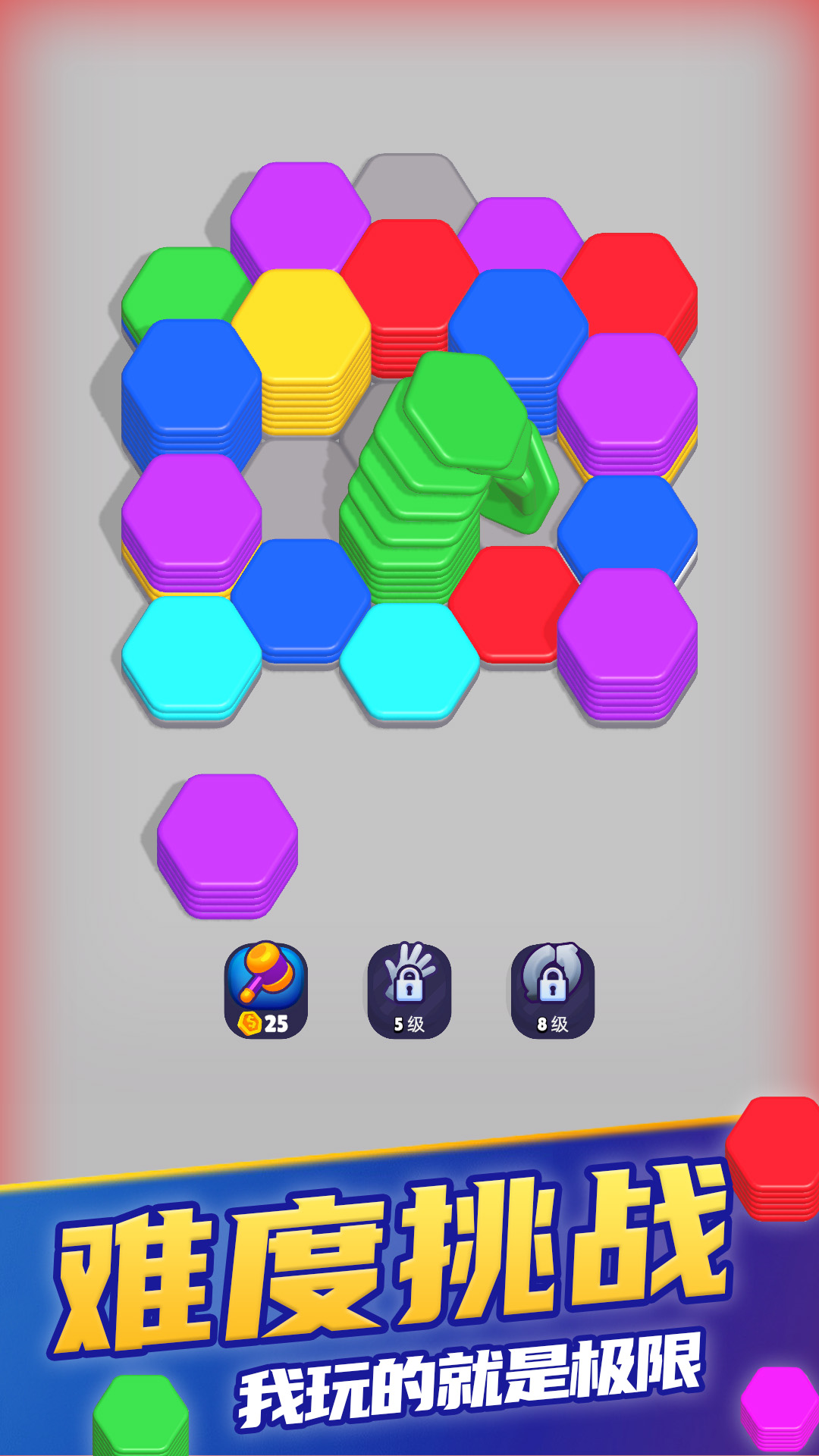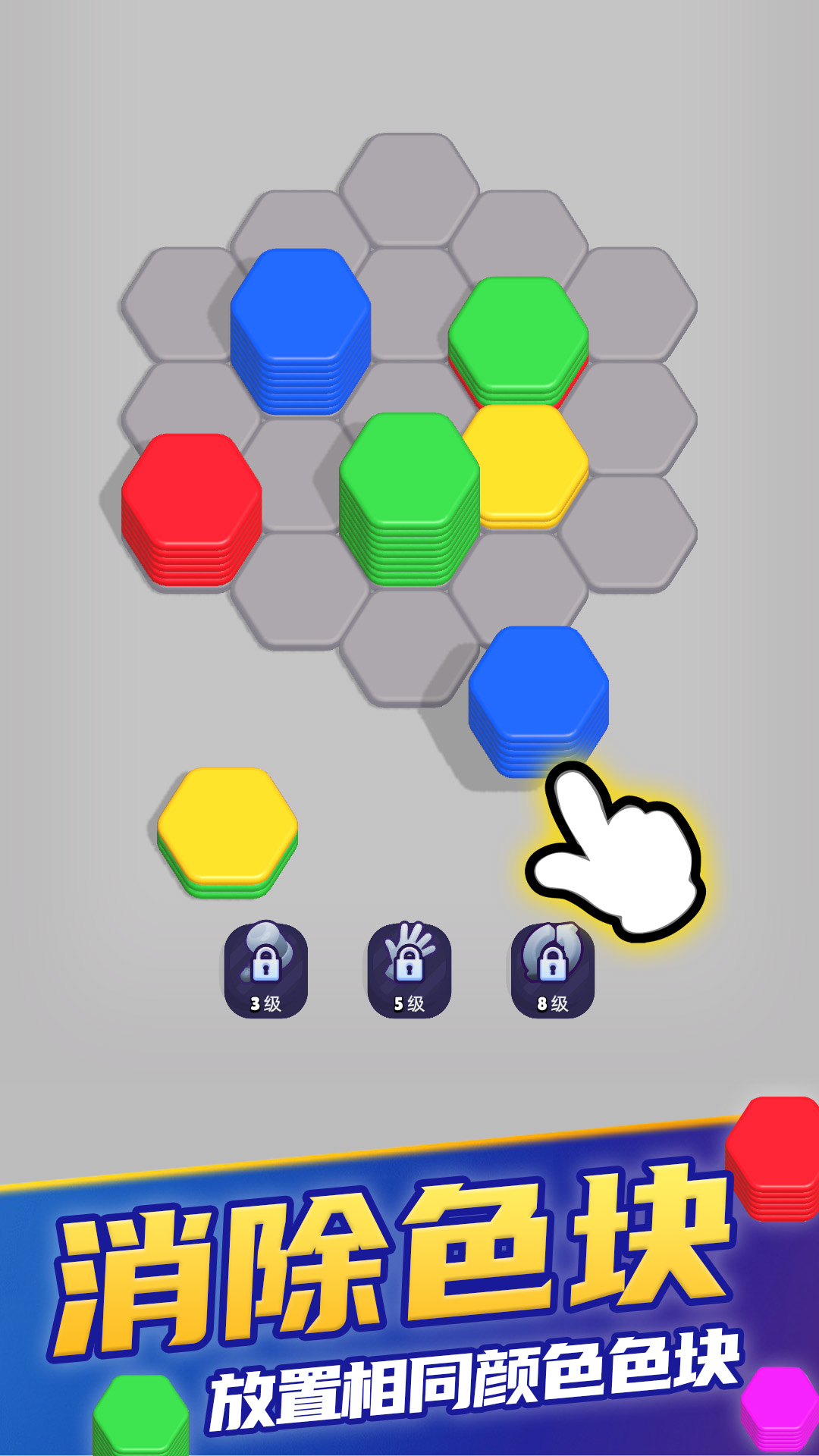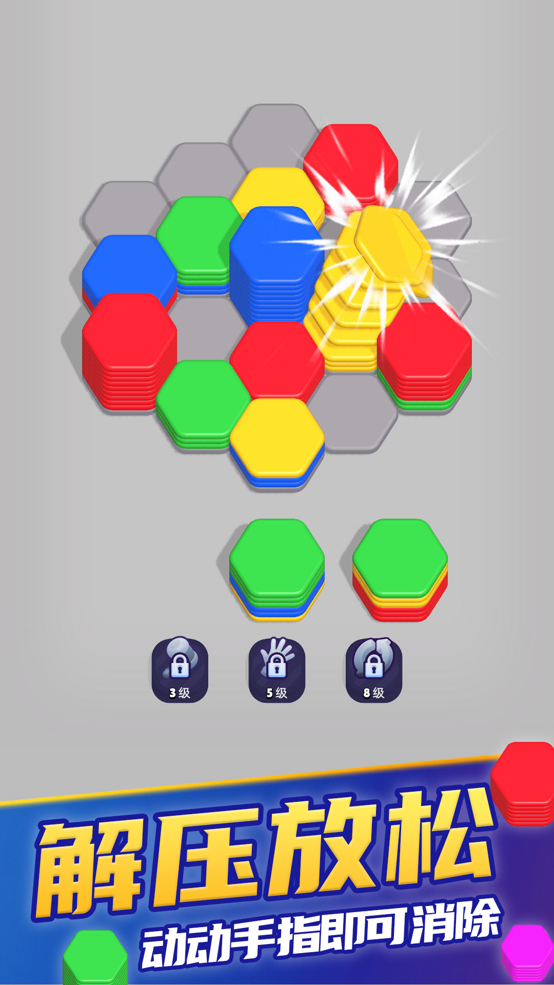 游戏特色: 1.解压放松身心,将五彩的六边形分类。升级以解锁更多具有挑战性的关卡 2.巧妙的解谜和逻辑策略来激发你的思维,是寻求脑力锻炼者的理想之选 3.结合了图块拼图挑战、策略匹配和令人心满意足的合并过程,让人身心愉悦 4.每次通过一个关卡,积分都会累积起来,并在收集完成后解锁特殊的地图