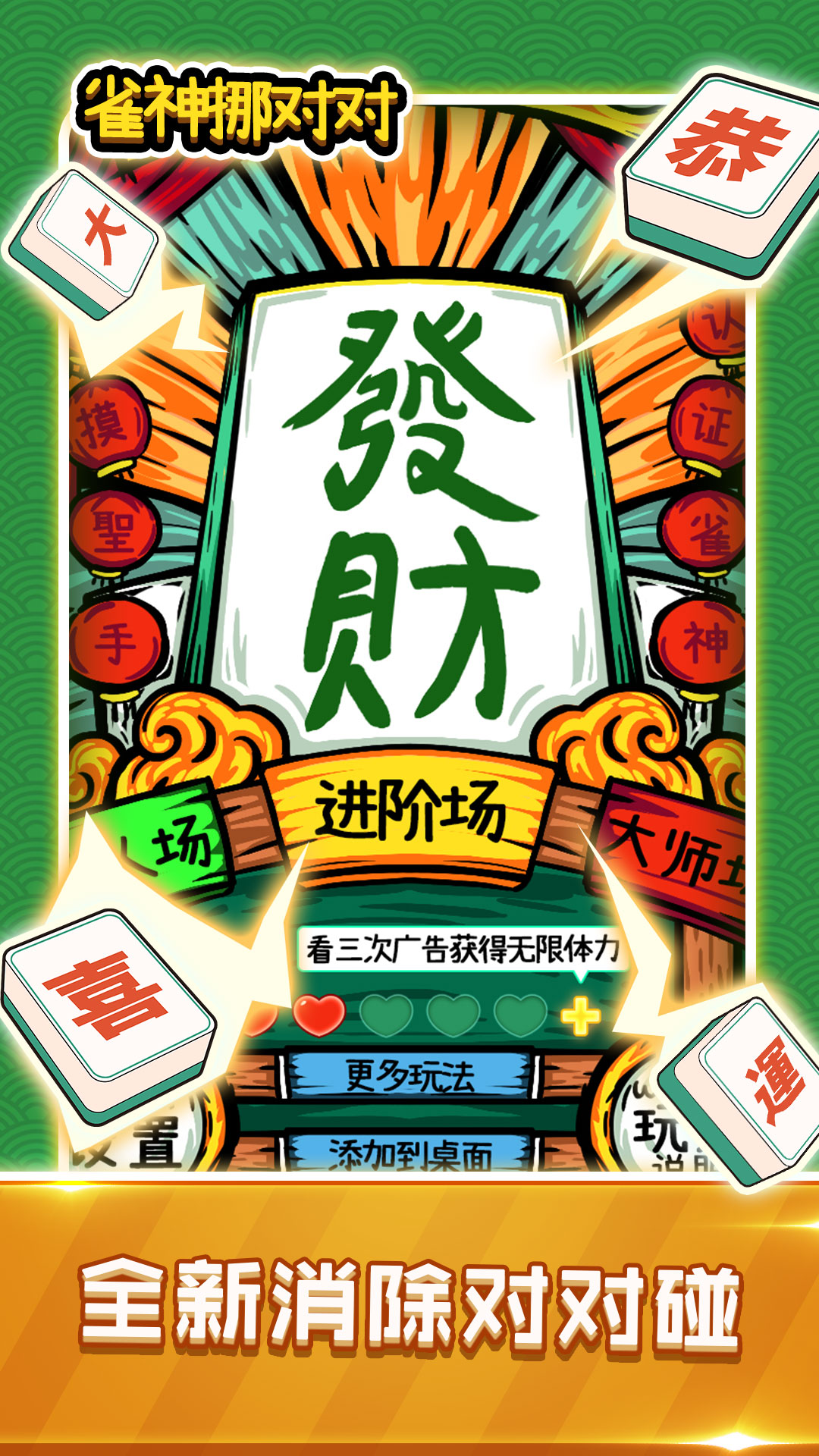 2,烧脑挑战,横向或竖向挪动麻将消除相同牌型的麻将。