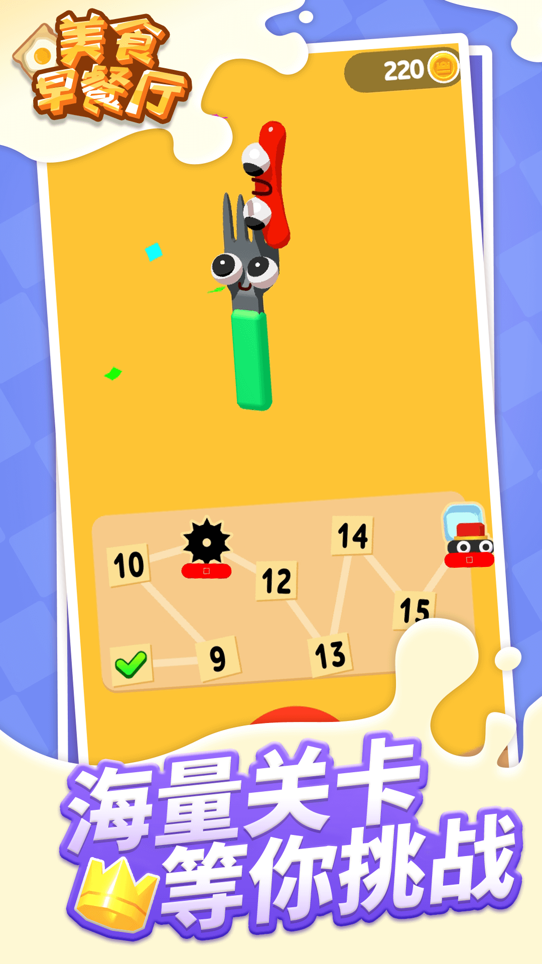 《美食早餐厅》是一款结合了物理谜题操作的益智闯关手游,利用叉子,在每个关卡中成功叉住香肠为准,利用不同的技能击败更多高级别的对手。你能叉你的香肠吗?测试您的技能并尝试击败所有级别!