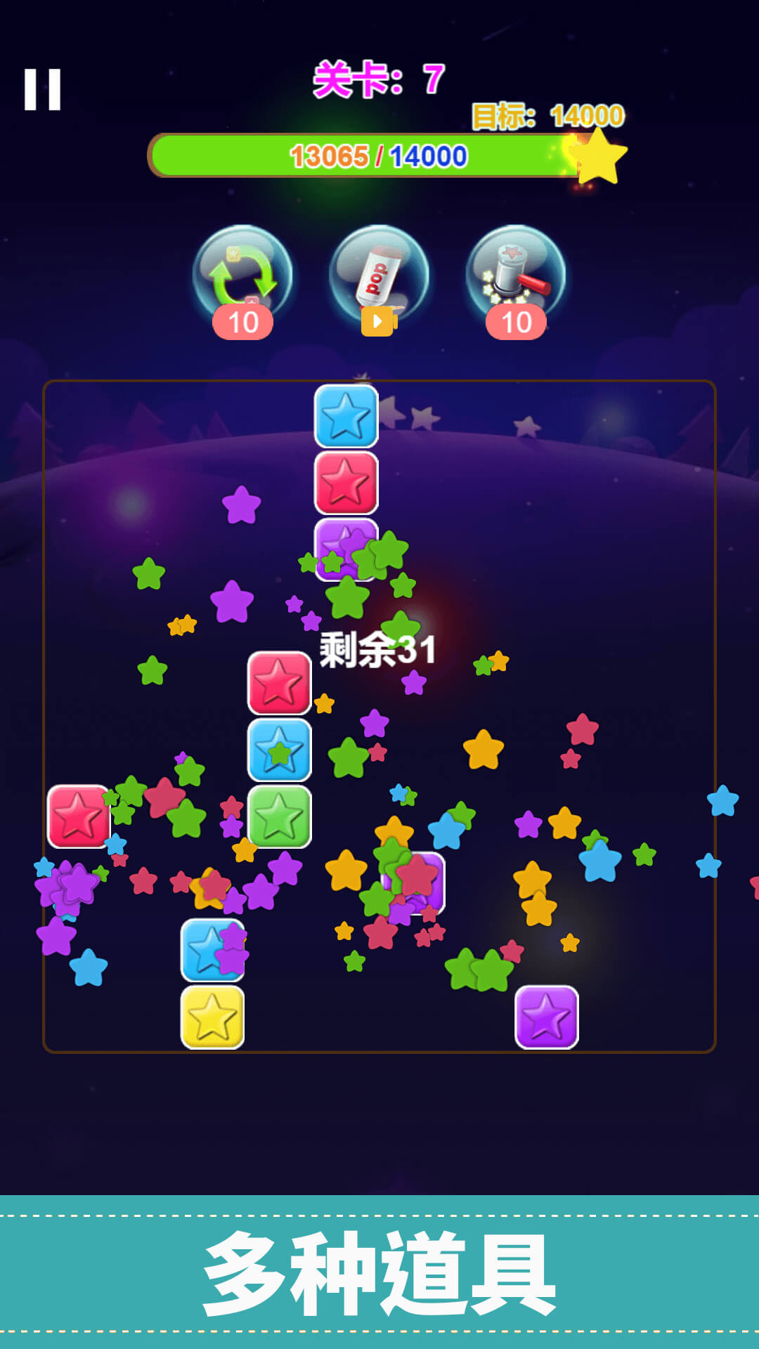 集合了经典的消灭星星玩法及俄罗斯方块消除和围住星星等变种玩法。既能体验经典的消灭星星乐趣,又能体验到不同的星星玩法。充满着乐趣。希望您能喜欢!