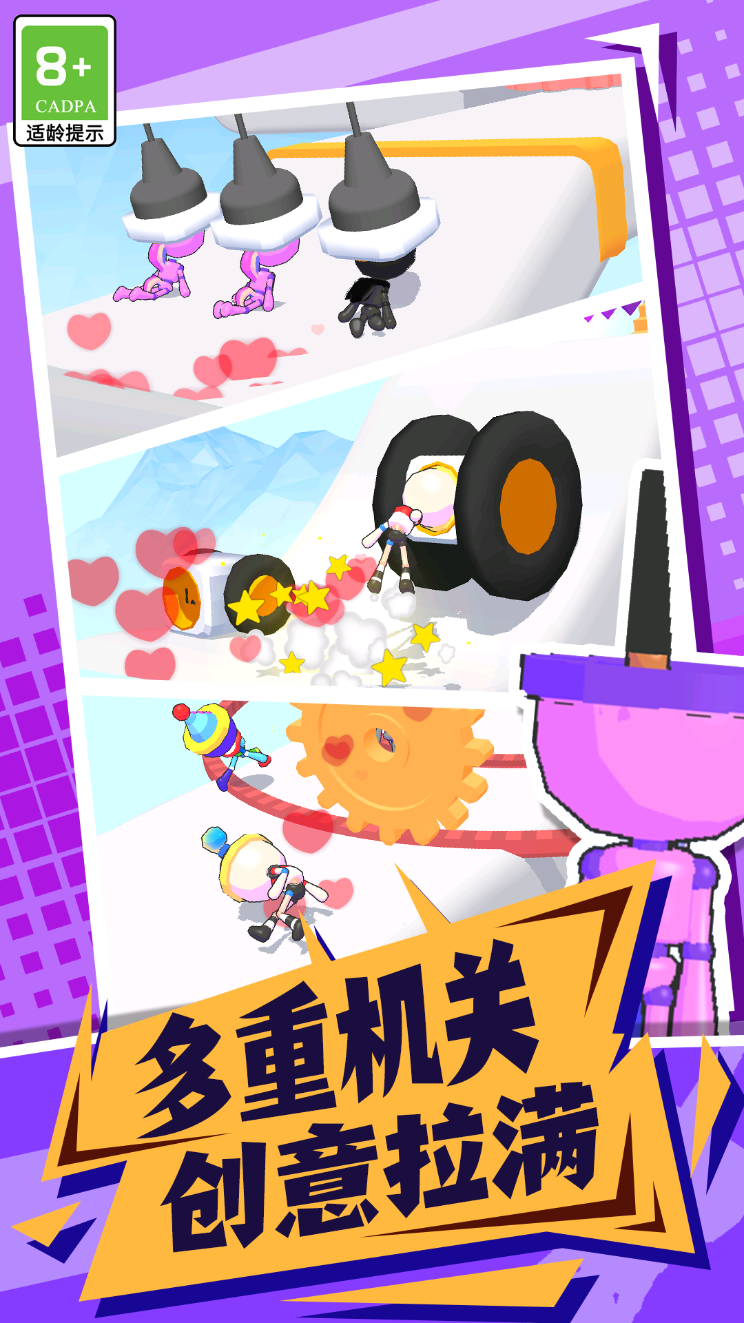 《果冻人快冲》是一款操作简单,趣味拉满的益智类闯关游戏,玩家扮演长者插座头的果冻人,一路狂飙,只有跑赢了的果冻人,才能找到心仪的插座。
