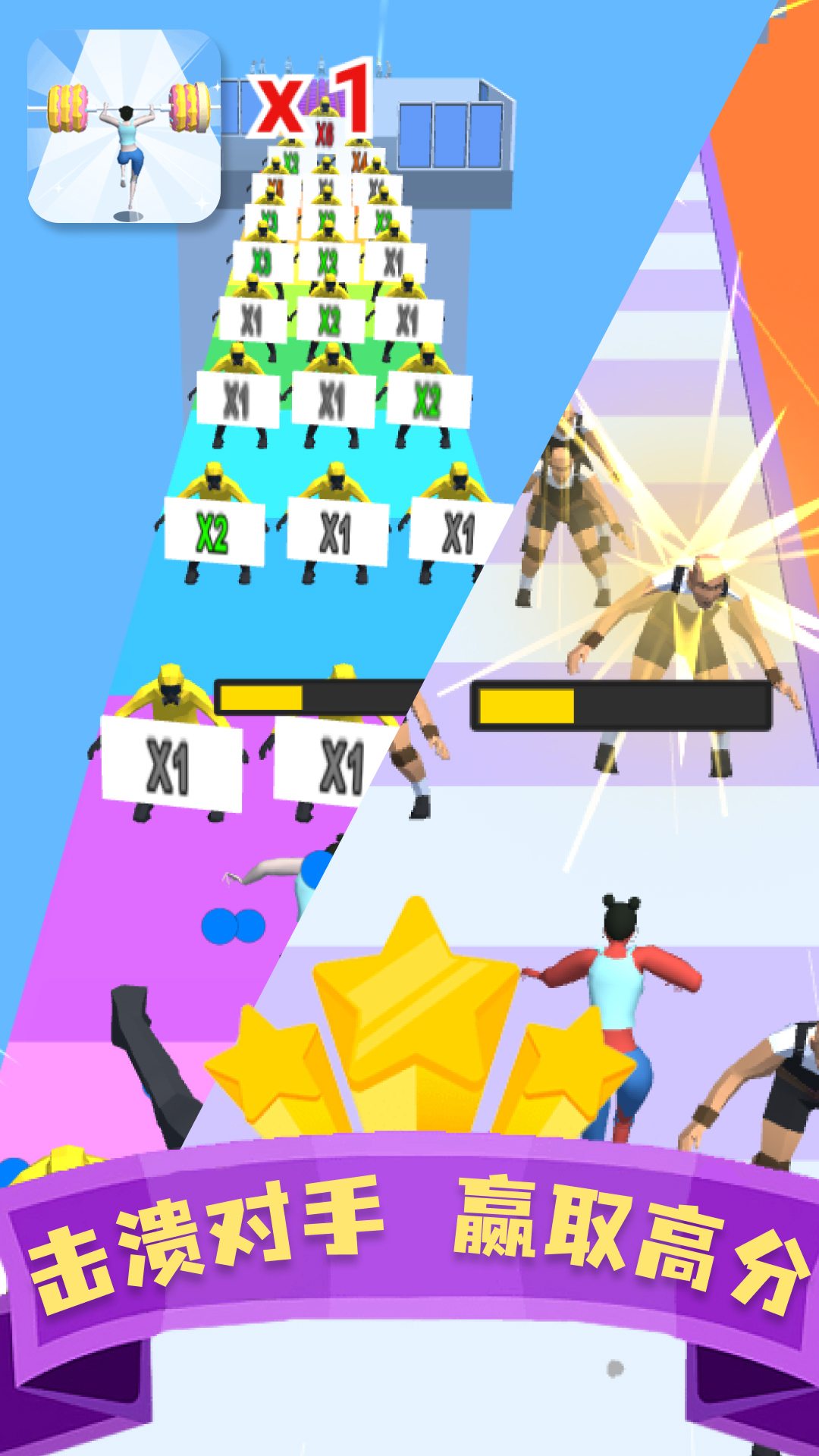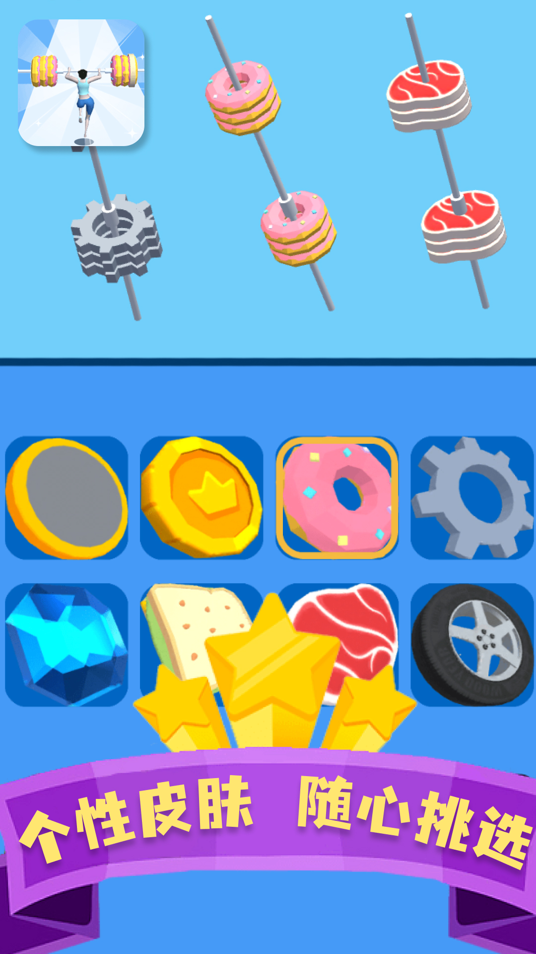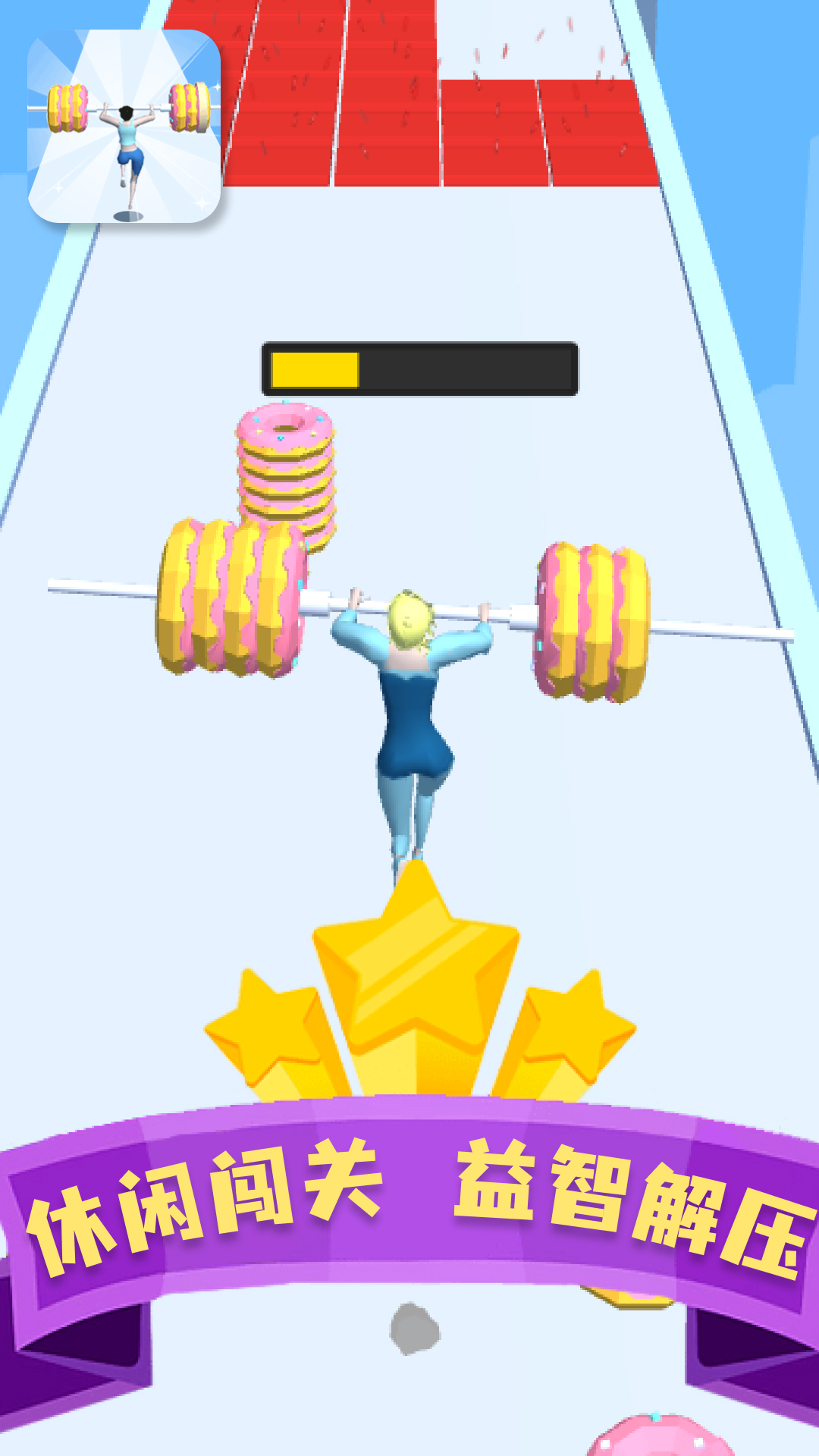 超休闲的举重跑酷小游戏,通过精心设计的赛道上收集哑铃,提升角色的举重能力,闪避赛道上的障碍和拾取道具,到达终点,游戏有精美的皮肤系统和角色动态设计,让你轻松游戏的同时享受画面的炫酷。